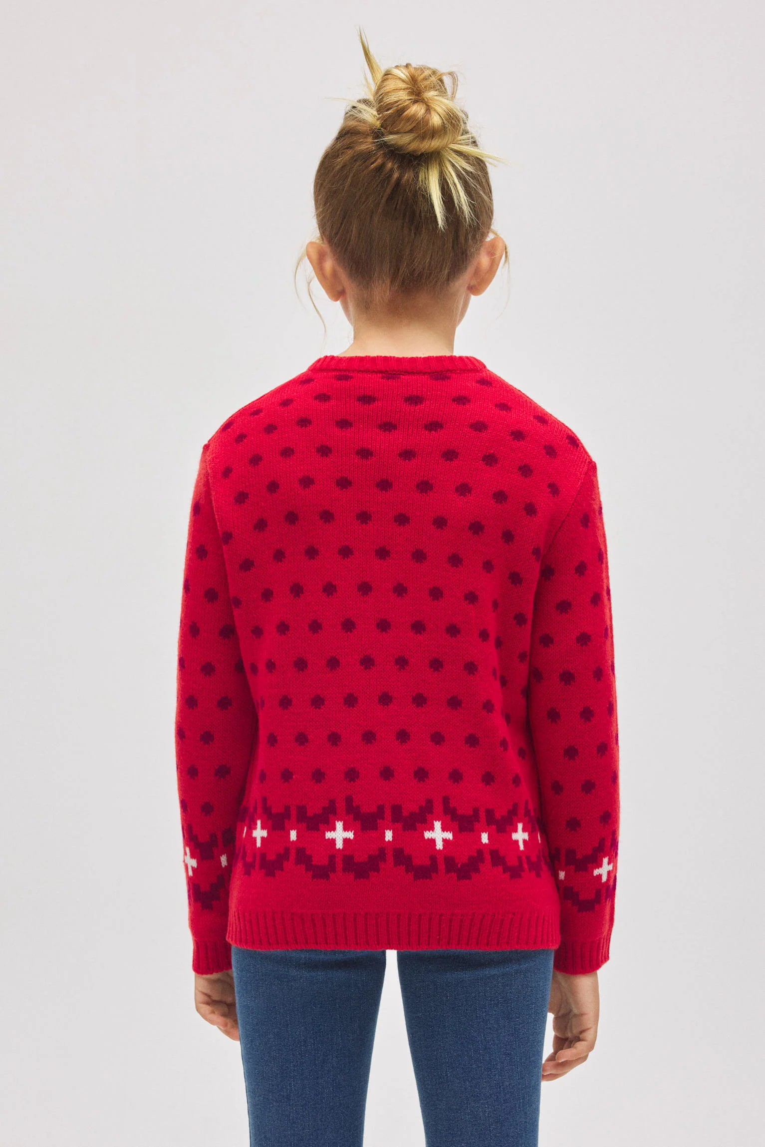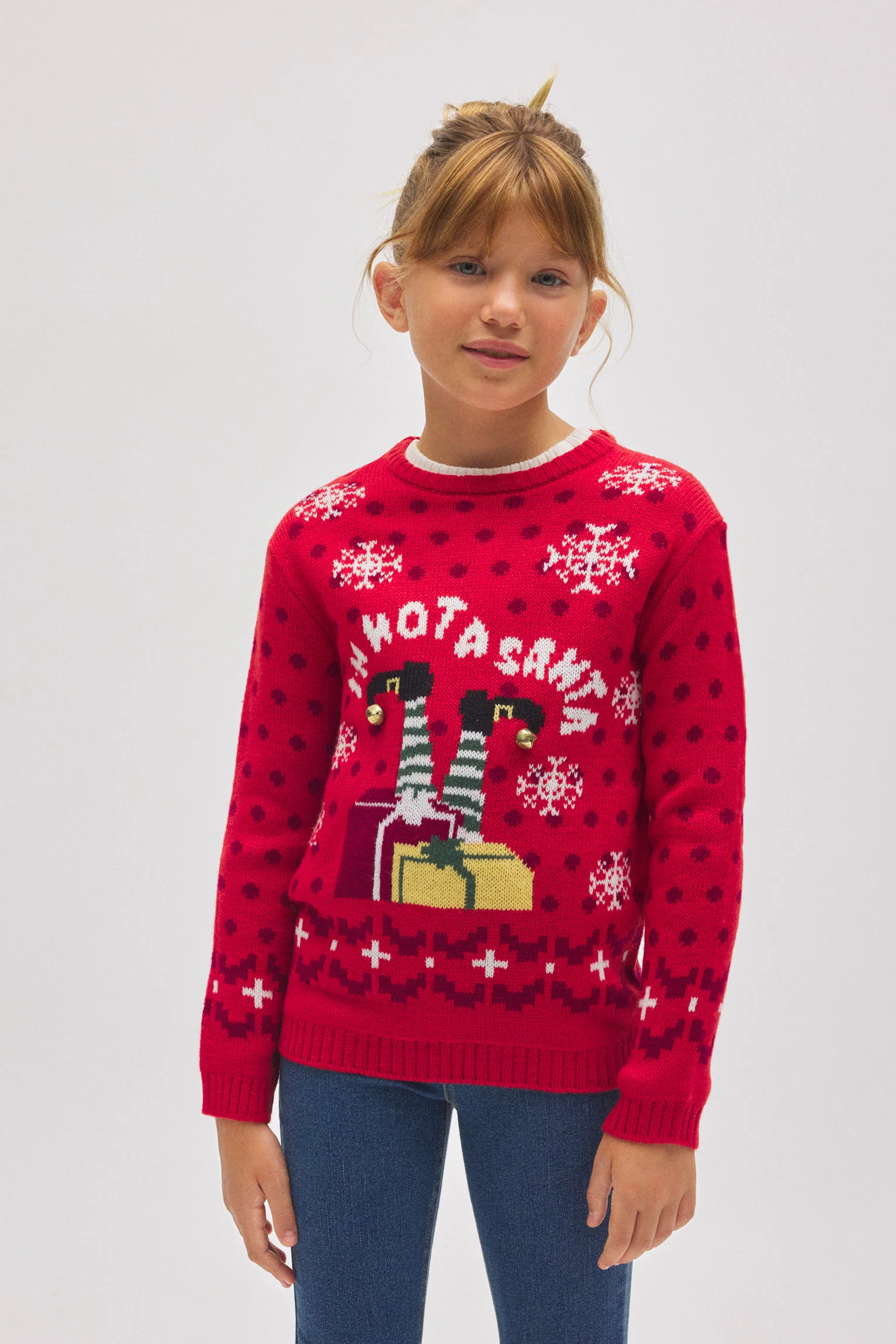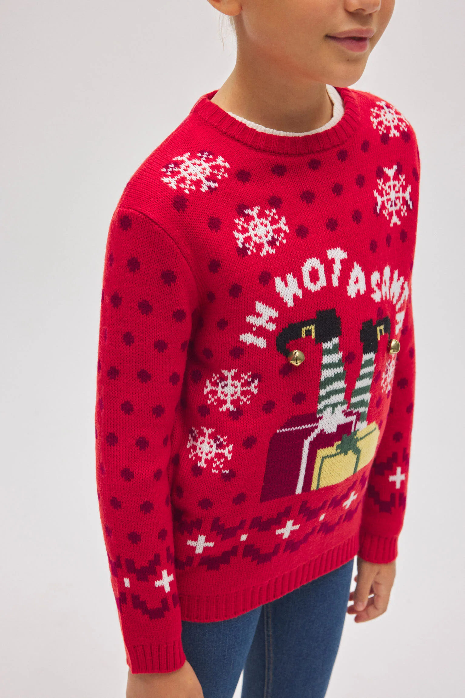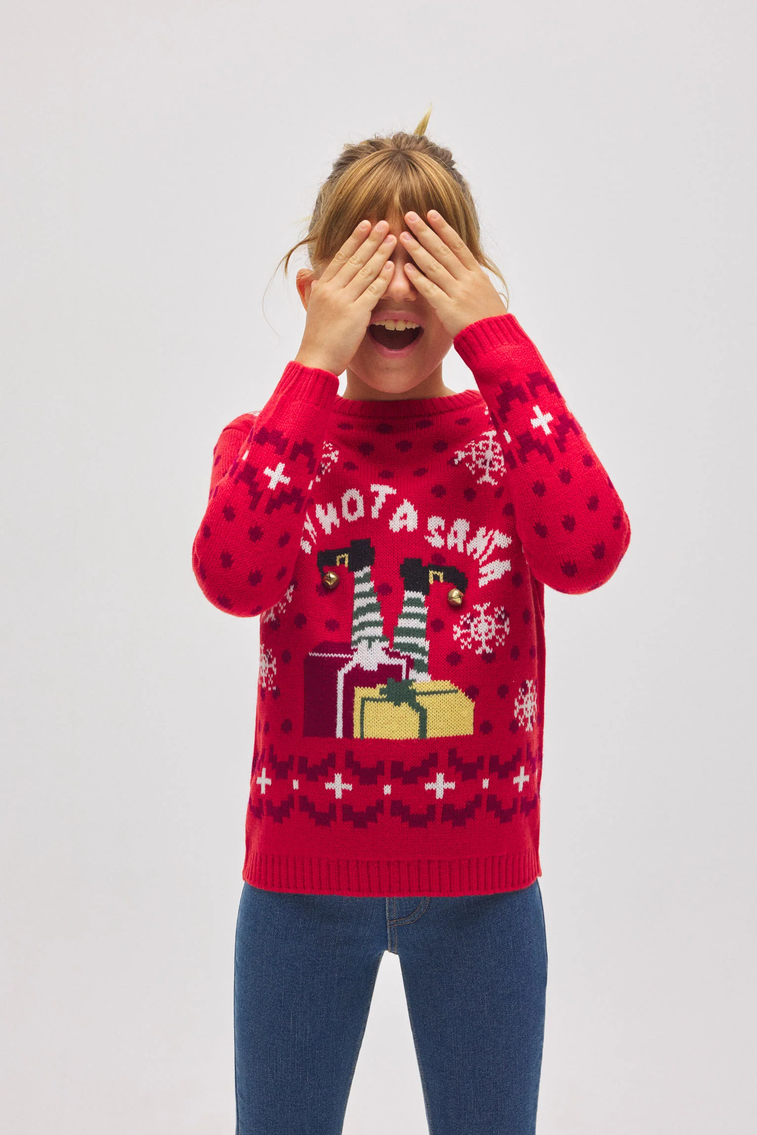 Questo maglione natalizio per bambini รจ perfetto per i piรน piccoli che festeggiano il Natale con entusiasmo e voglia di giocare. In un rosso intenso, presenta un motivo con gambe di elfo che spuntano dai regali, fiocchi di neve e la scritta “Non sono Babbo Natale”. Il dettaglio piรน divertente: veri campanellini incorporati nei piedi dell’elfo, che tintinnano mentre si muove.