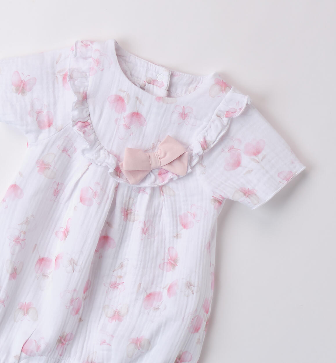 Pagliaccetto per neonata Minibandaย realizzato in muslin 100% cotone. Il modello presenta apertura sul retro e nel sottogamba con bottoni per agevolare il cambio e la vestizione. Il pagliaccetto รจ in fantasia allover con fiocco in arricchimento.