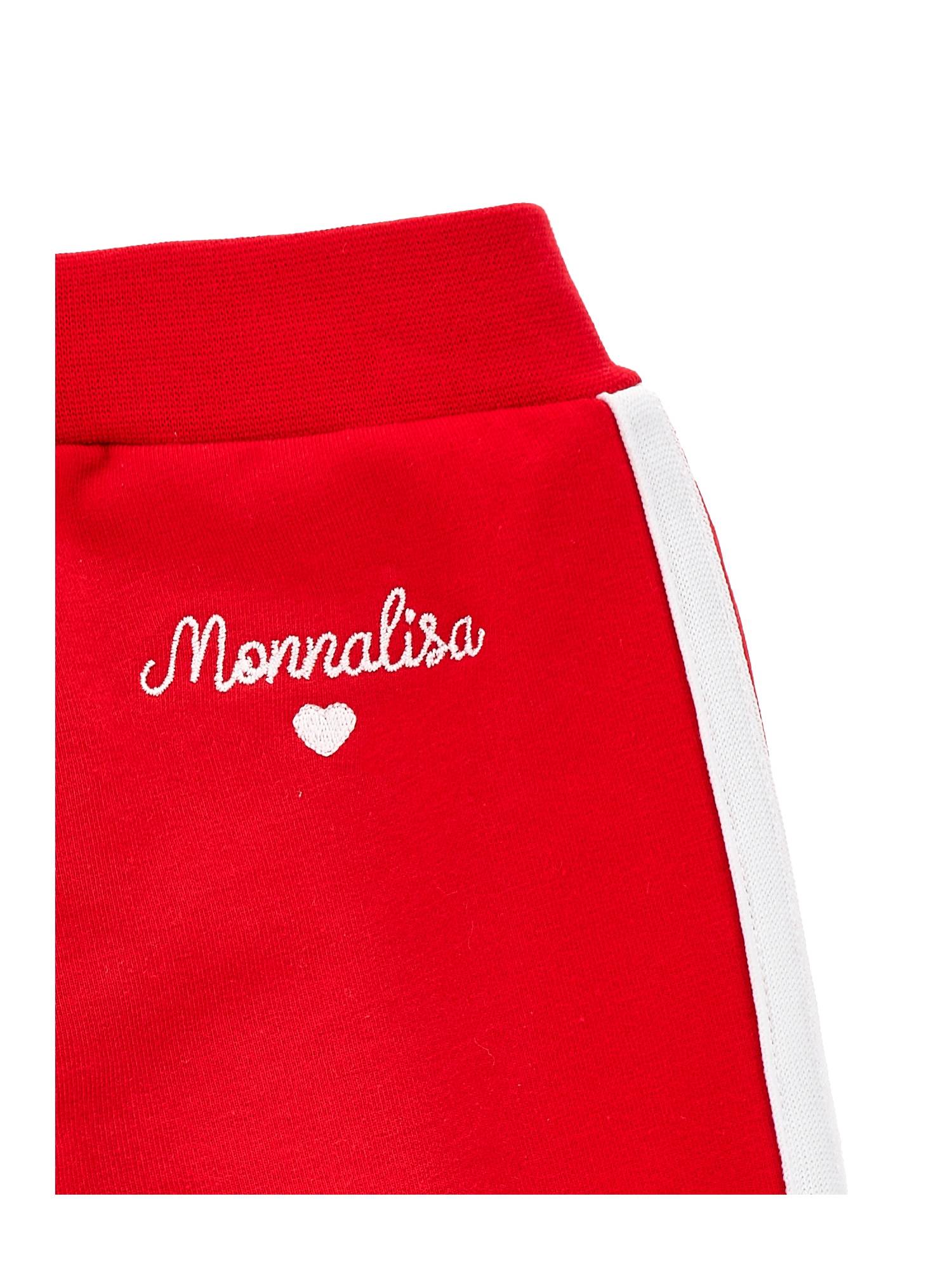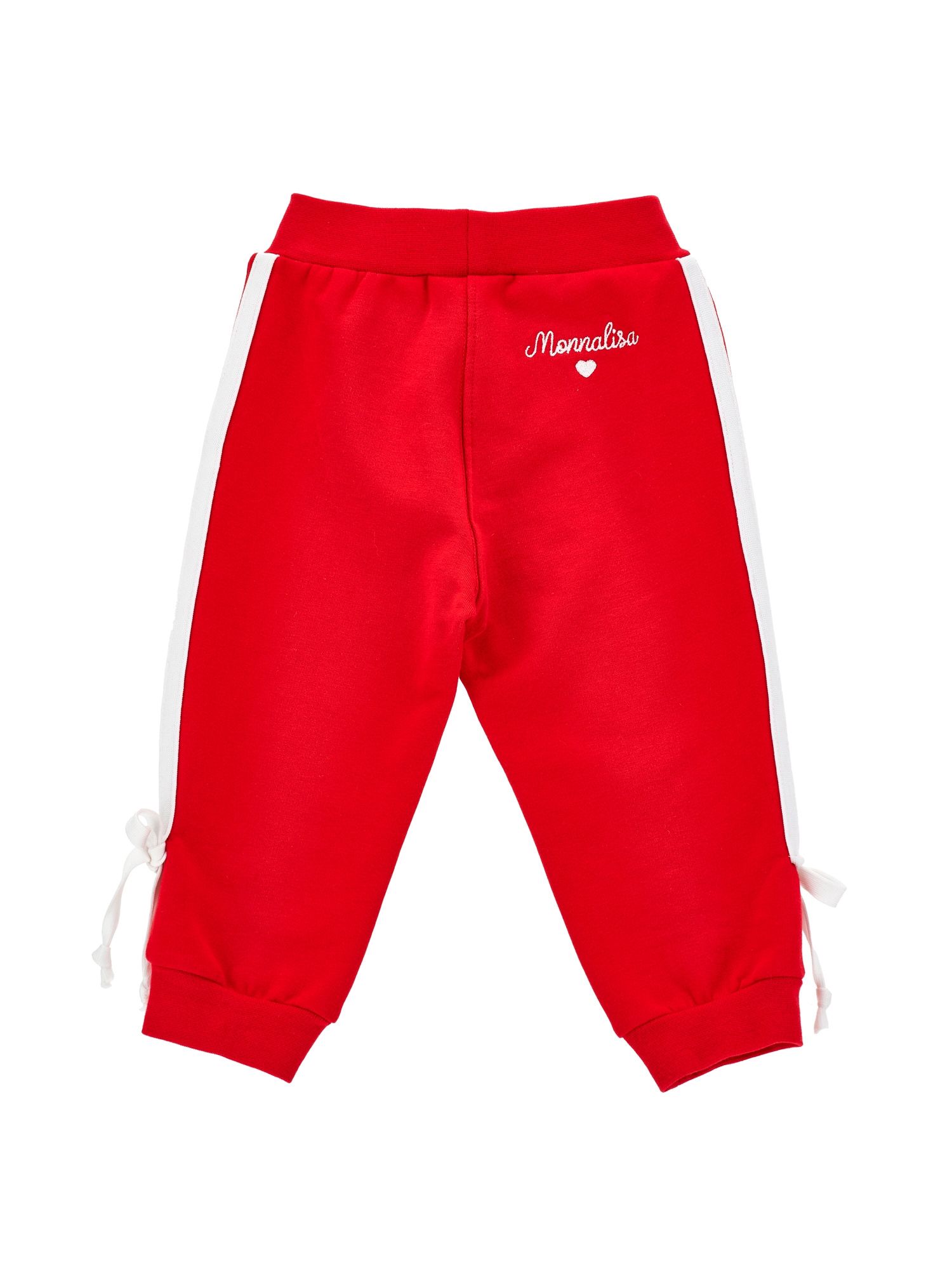 Pantaloni Monnalisa modello sportivo, di colore rosso con lacci decorativi laterali, elastico in vita per un massimo comfort, logo monnalisa ricamato sul retro, tessuto morbido e resistente.