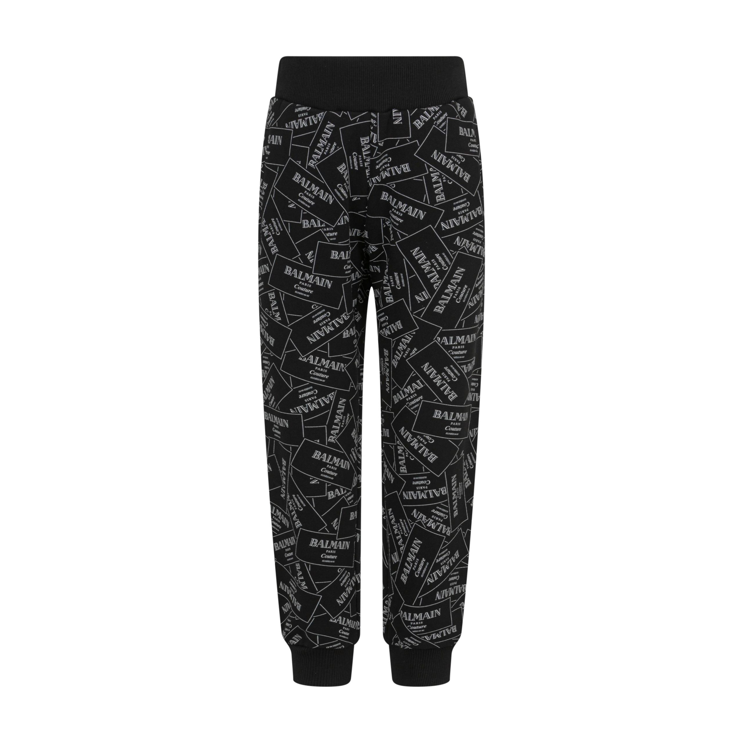 Pantaloni sportivi per bambino Balmain Kids, realizzato in cotone 100%, il prodotto presenta un colore nero, vita elasticizzata, due tasche laterali a filetto, stampa con logo all-over, orli alle caviglie elasticizzati.