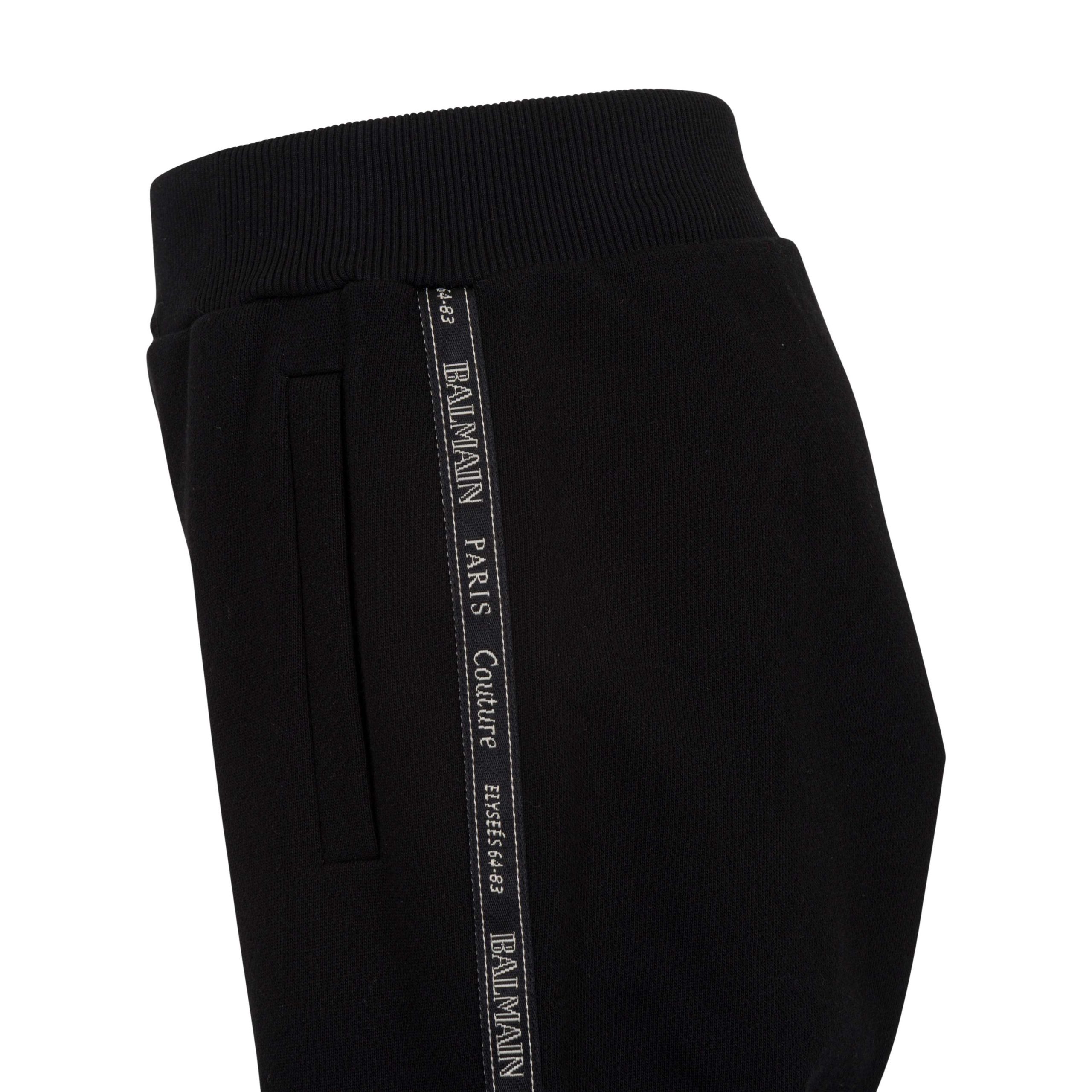 Pantaloni per ragazzi Balmain Kids neri. Realizzato in cotone biologico 100%. Il prodotto presenta un colore nero, elastico in vita, tasche laterali, accentuato da ampie strisce laterali con il logo Balmain Paris.