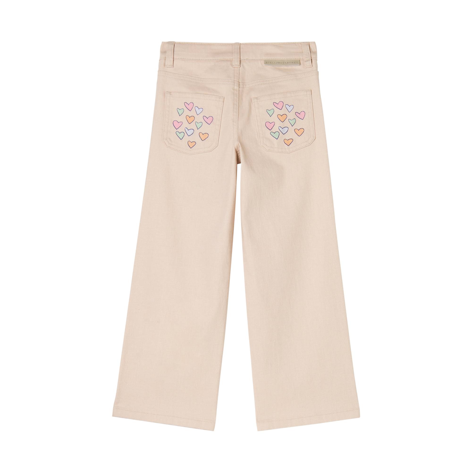 Pantaloni nude cinque tasche, in misto cotone organico, con passanti per cintura, chiusura frontale con zip, cuori stampati sulle tasche posteriori.