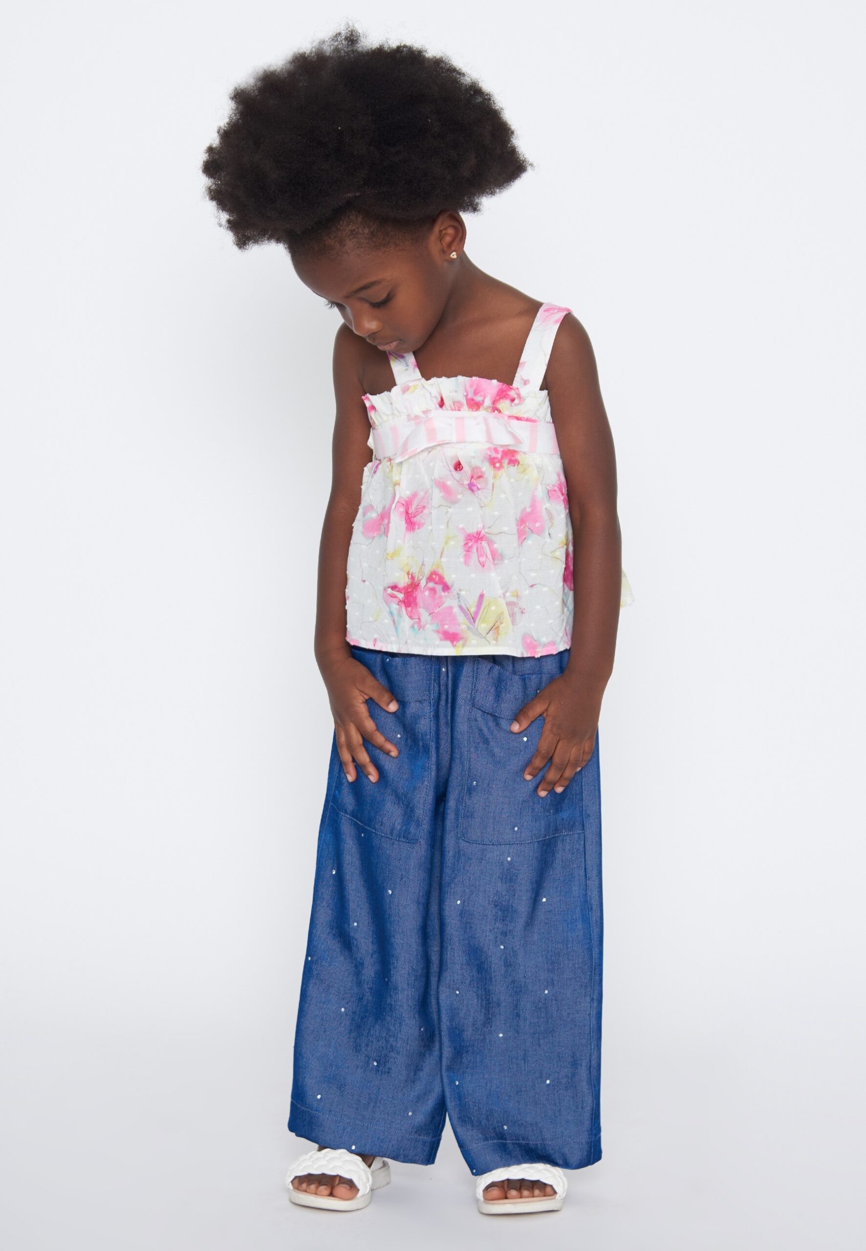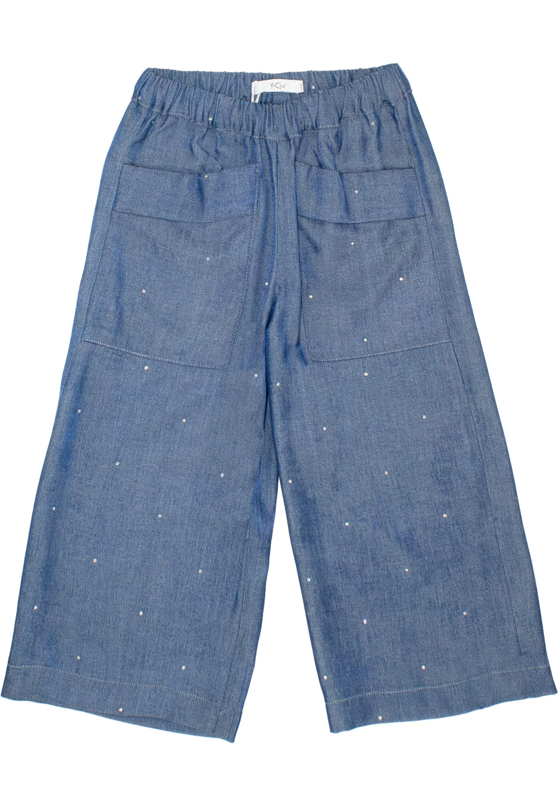 Pantaloni largo e comodo con strass sparsi, ideale per un look rilassato ma con un tocco di brillantezza.