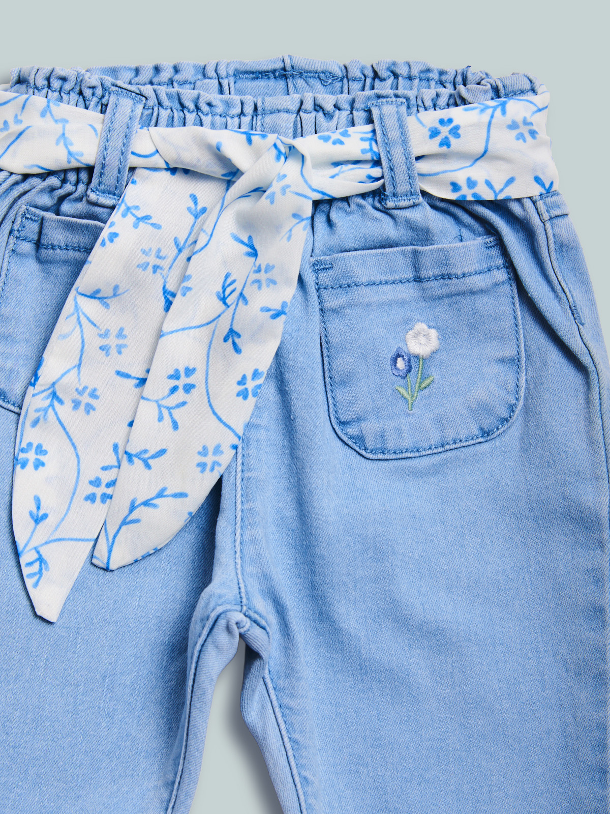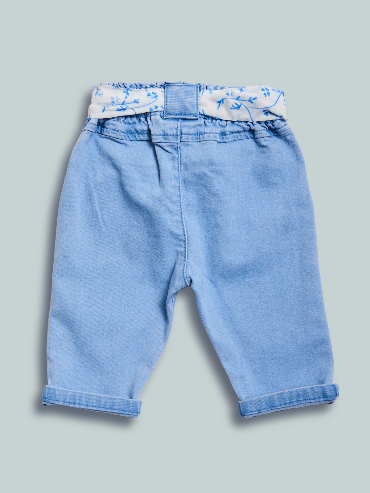 Pantaloni paperbag in denim. Vita alta arricciata con fusciacca removibile stampata fantasia, tasche anteriori con ricamo. Vestibilitร morbida, da indossare anche con risvolto per un look sportivo.