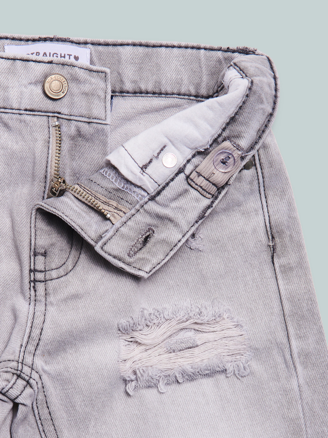 Pantaloni in denim grigio con vita regolabile e apertura con zip e bottone. La vestibilitร straight, i microstrappi e la sabbiatura davanti e dietro rendono il capo molto grintoso e di tendenza.