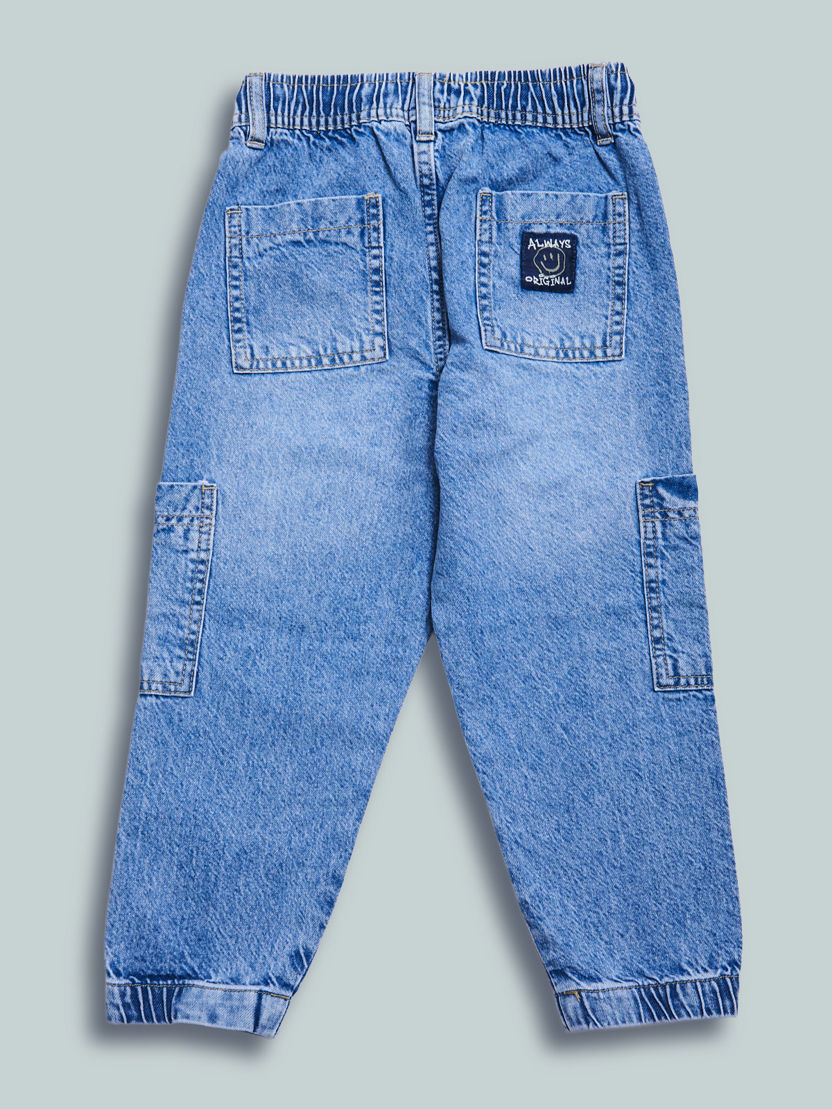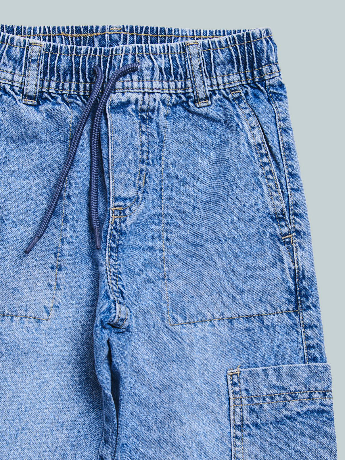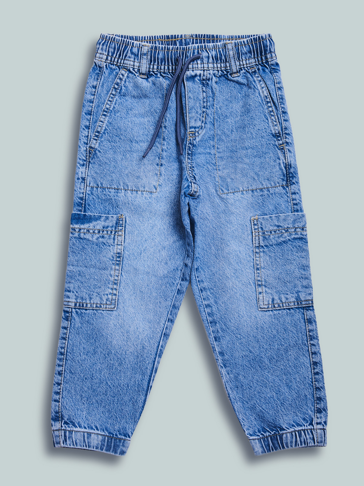 Pantaloni in denim fermo, modello jogging con vestibilitร regular linea diritta, vita elasticata e coulisse regolabile, fondo gambe con elastico. Tasche applicate davanti, dietro e laterali, lavaggio chiaro effetto vissuto. Un evergreen del guardaroba, da abbinare a qualsiasi look di stagione.