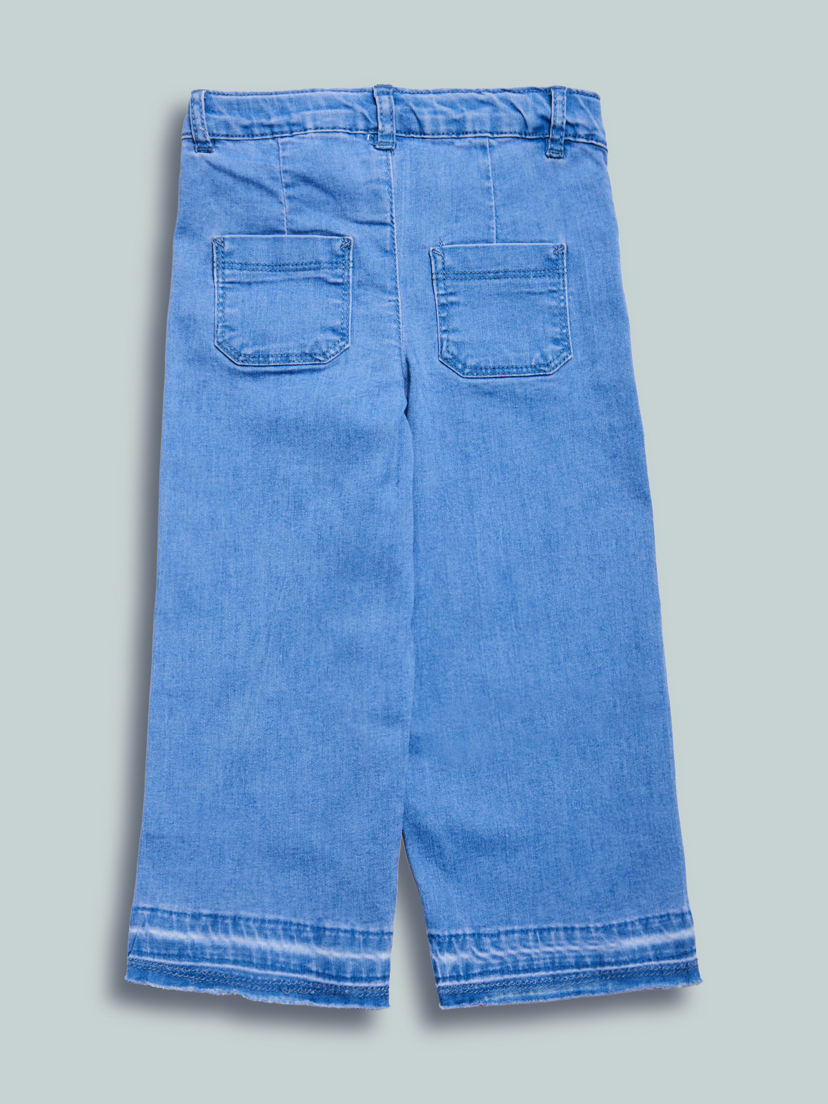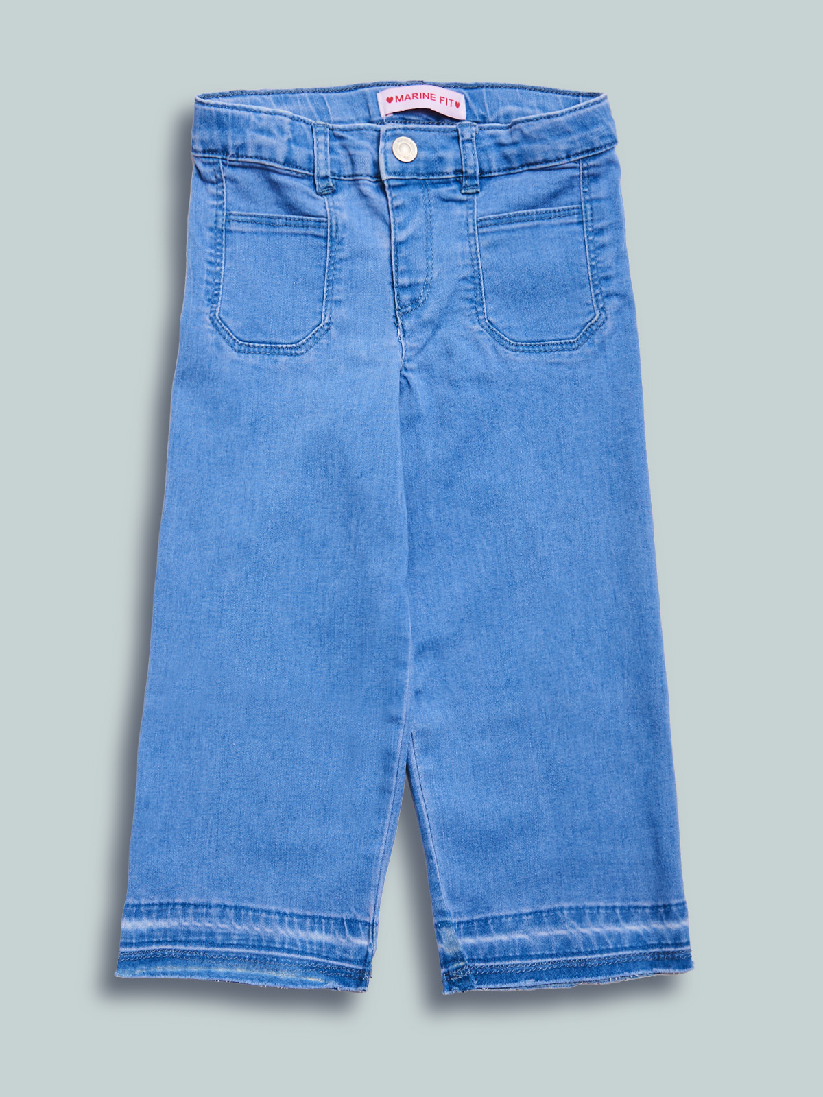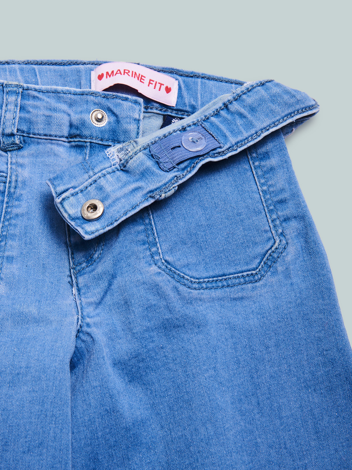 Pantaloni in morbido denim elasticizzato, vestibilitร marine fit. Elastico regolabile in vita e apertura con bottone per maggiore comoditร . Un capo con dettagli femminili, un must have della stagione.