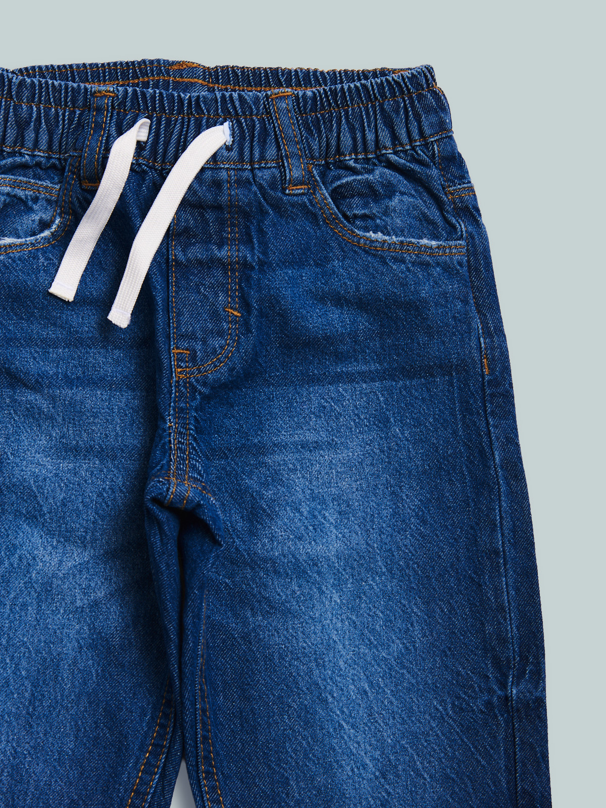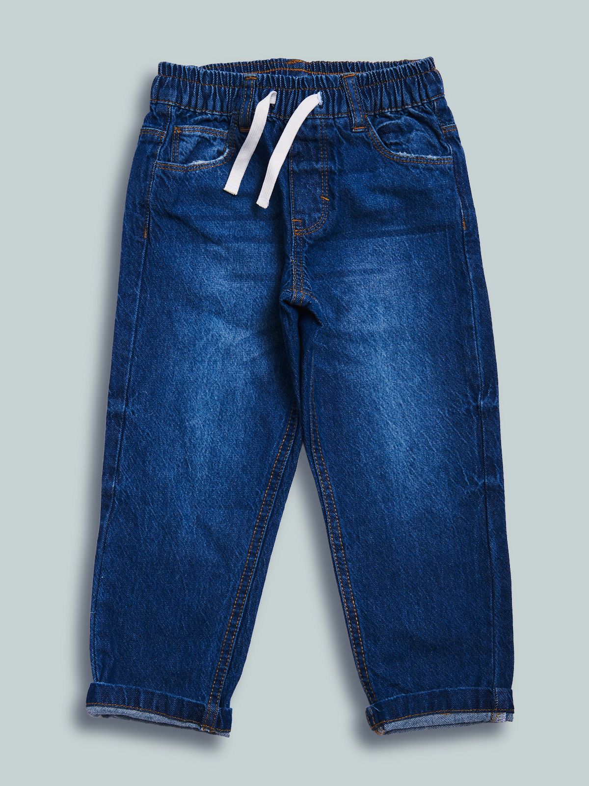 Pantaloni in denim fermo, non elasticizzato. Modello cinque tasche con vestibilitร regular linea diritta, vita elasticata e coulisse regolabile. Lavaggio medio effetto vissuto. Un evergreen del guardaroba, da abbinare a qualsiasi look di stagione.