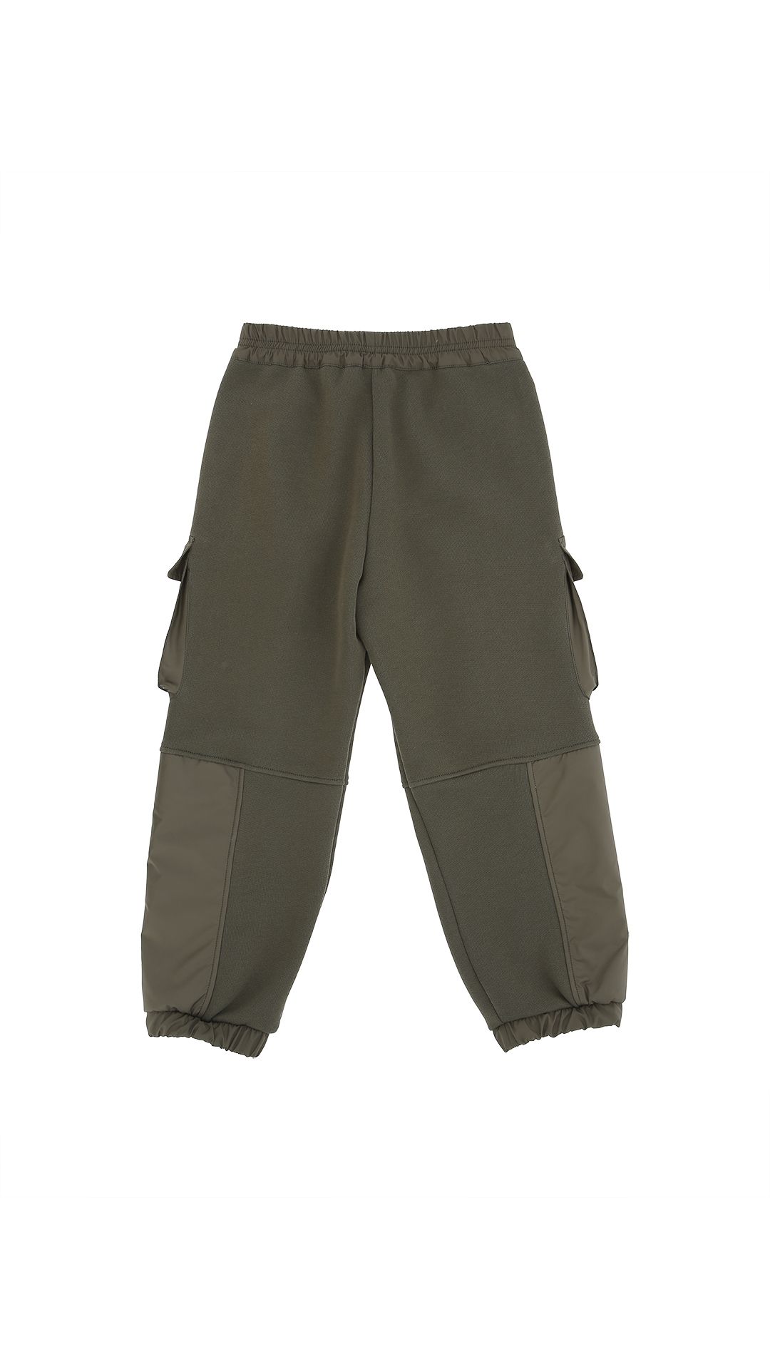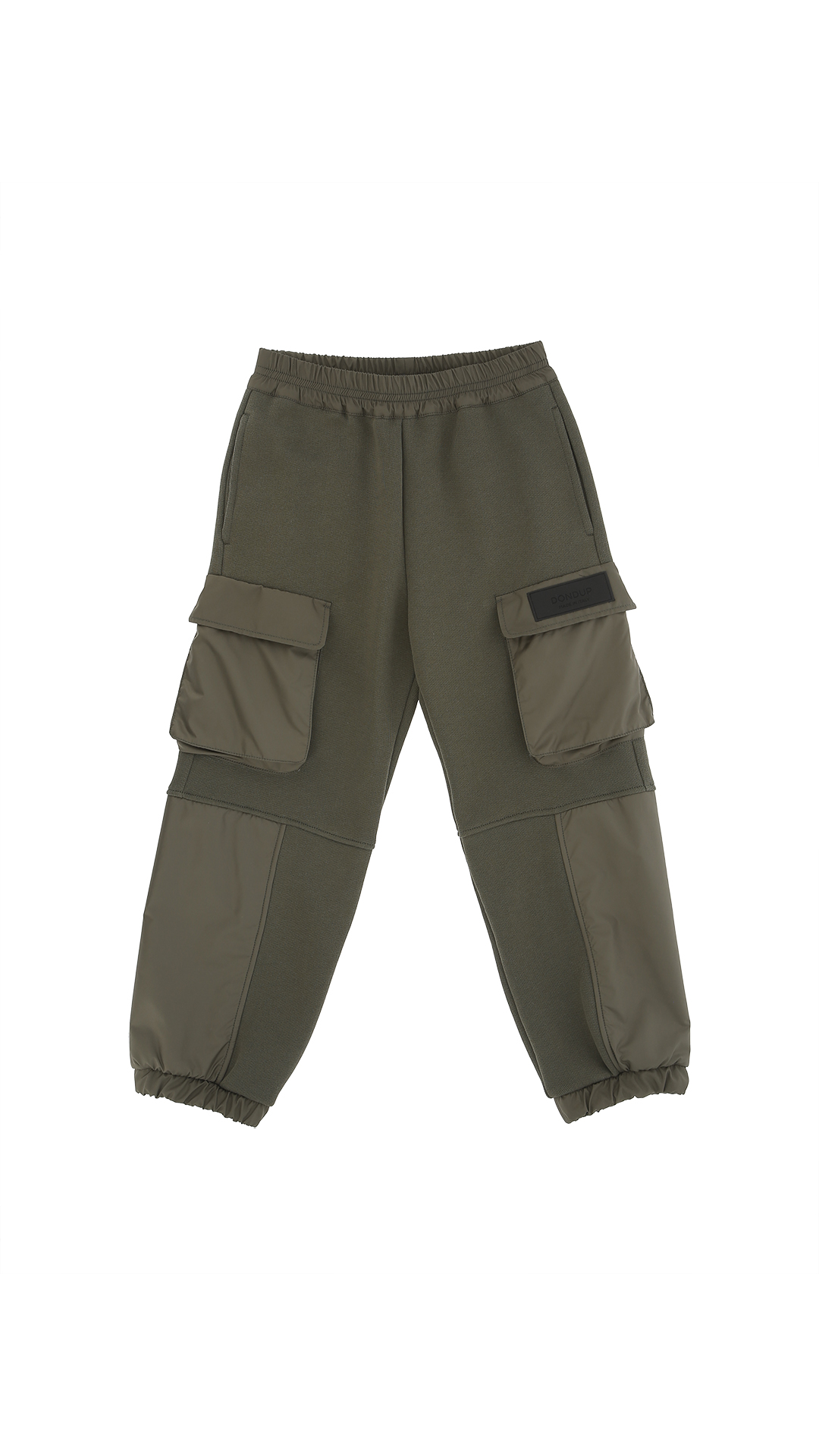Pantaloni Dondup per ragazzi e bambini di colore verde militare, con elastico in vita e tasche a filetto. L'articolo presenta dei tasconi sul davanti e inserti in nylon con logo gommato sulla tasca, caratterizzati da inserti di nylon anche sulla parte inferiore delle gambe ed elastico alle caviglie.