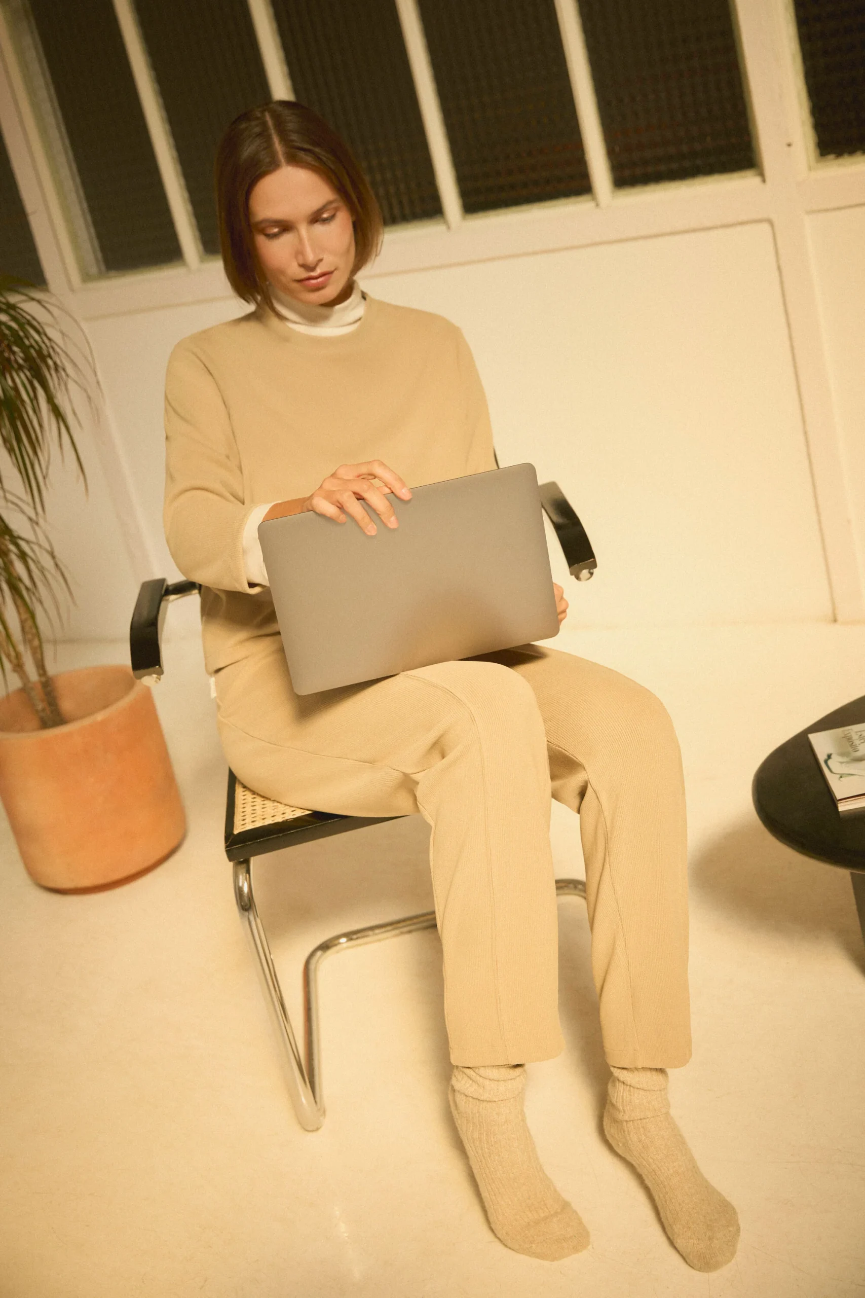 Tessuto effetto velluto a coste: Una texture calda, che ti tiene al caldo tutto il giorno.