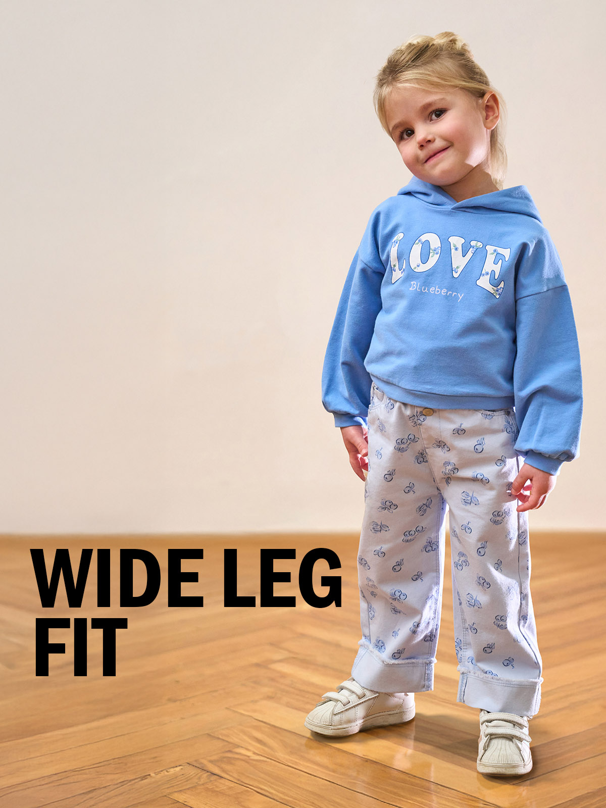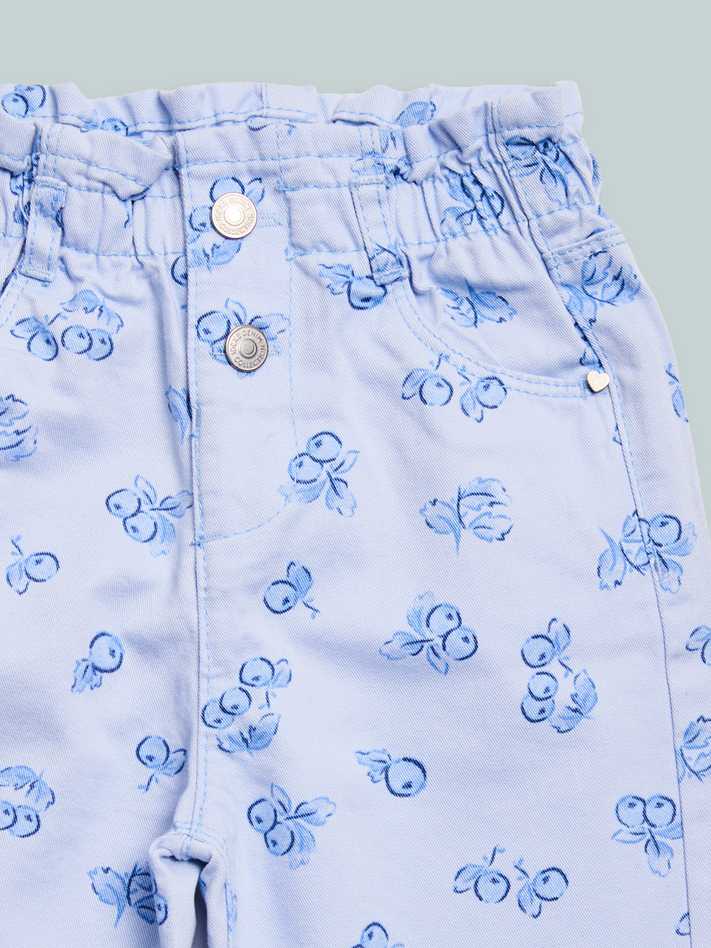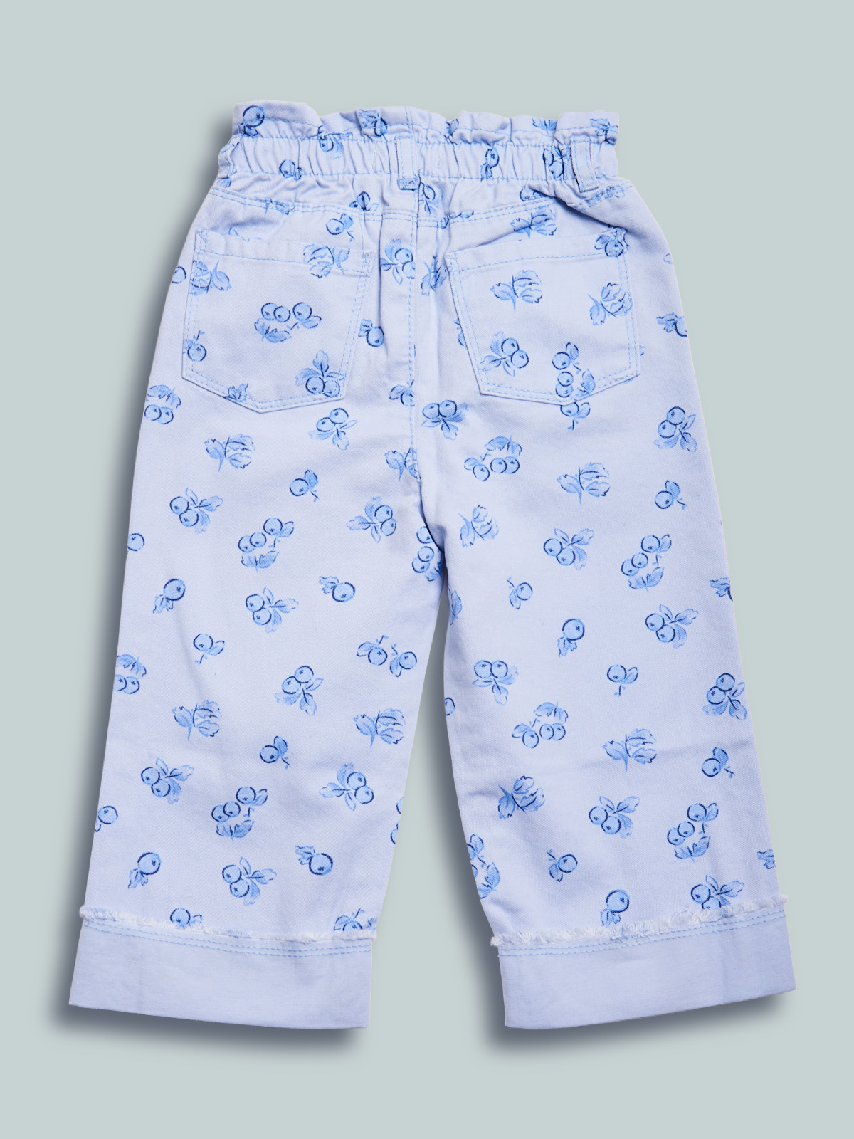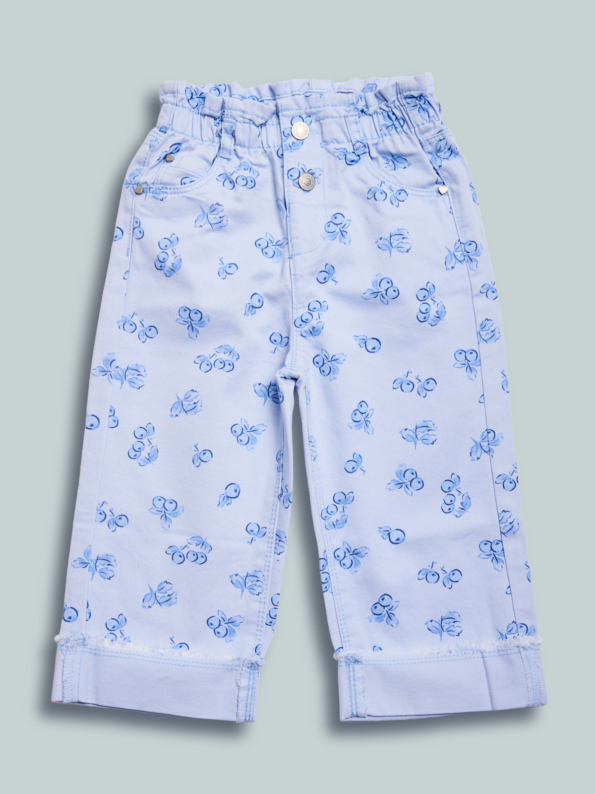 Pantaloni in morbido drill fantasia mirtilli. Vita elasticata e apertura con bottone per maggiore comoditร . Modello wide leg con risvolto al fondo. Un capo comodo e versatile al tempo stesso.