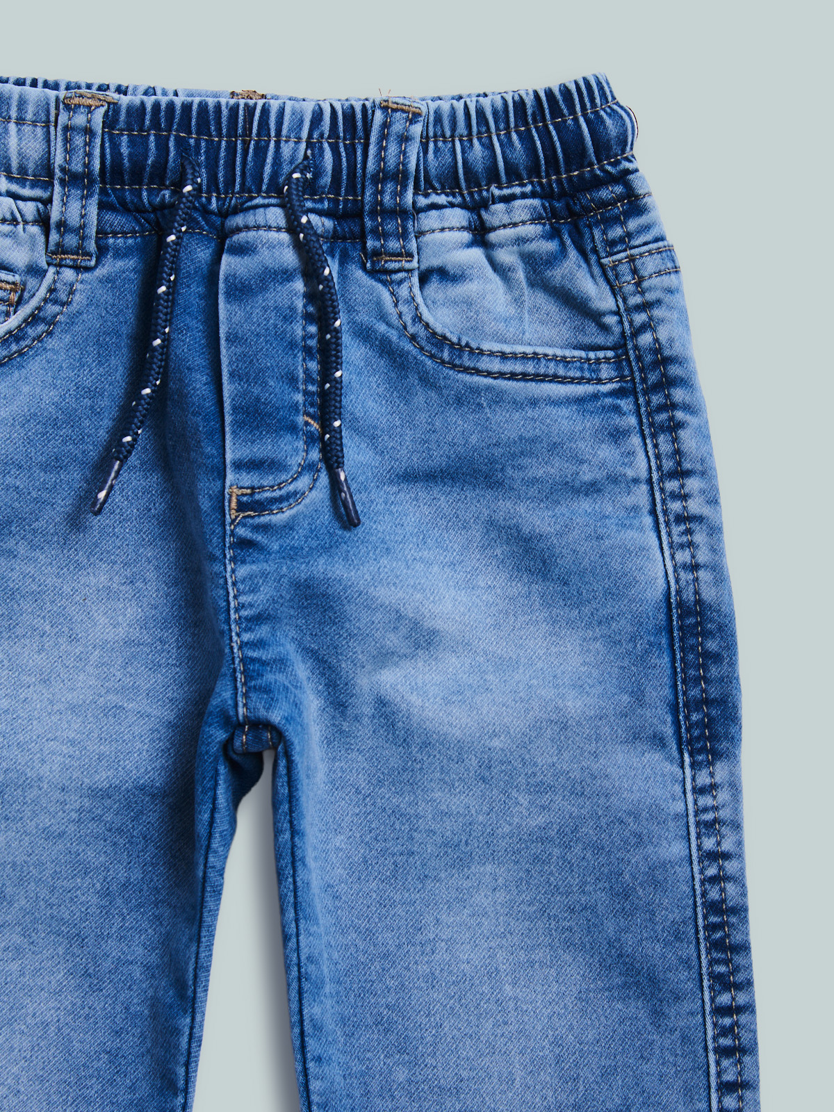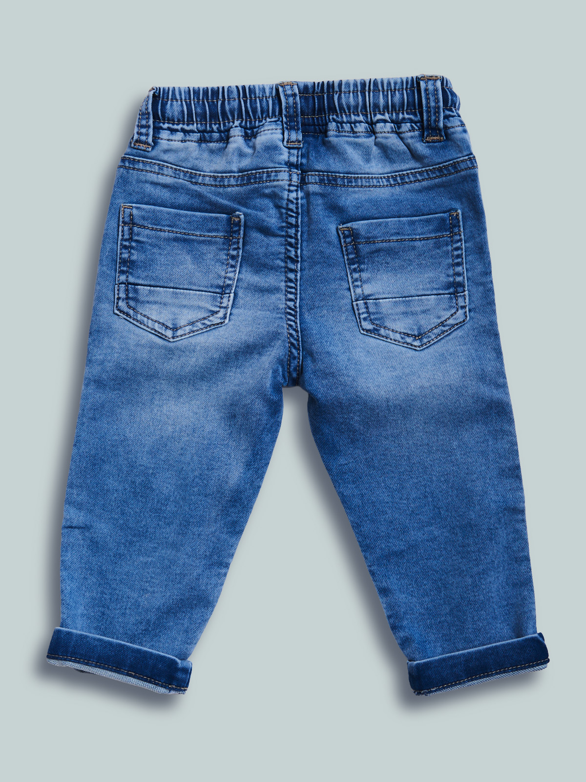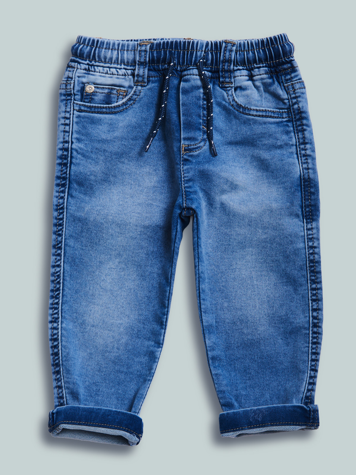Pantaloni in felpa effetto denim, un morbido tessuto elasticizzato che ha il comfort di una felpa ma l’aspetto di un denim. Modello cinque tasche con vita elasticata e coulisse regolabile. Lavaggio effetto “vintage”. Un capo molto pratico e versatile che non puรฒ mancare nell’armadio del vostro bambino.