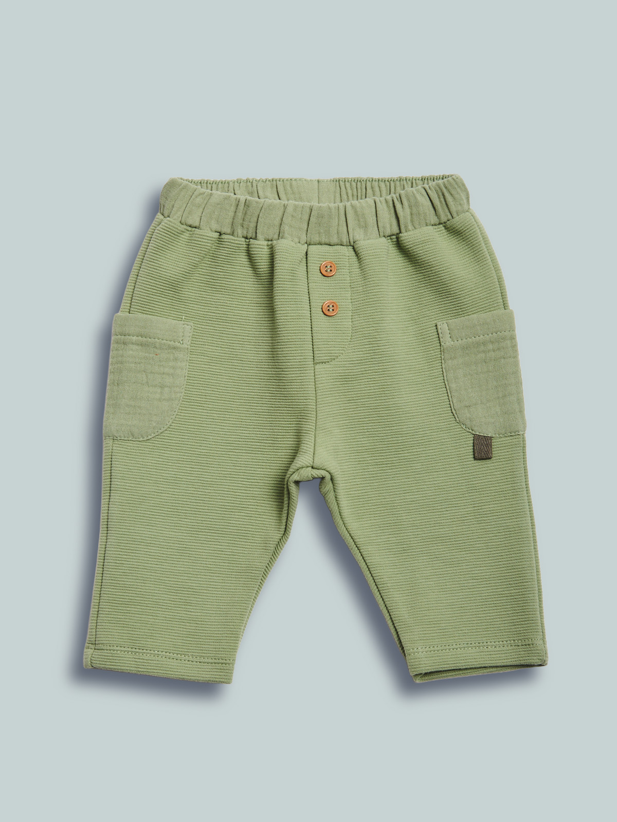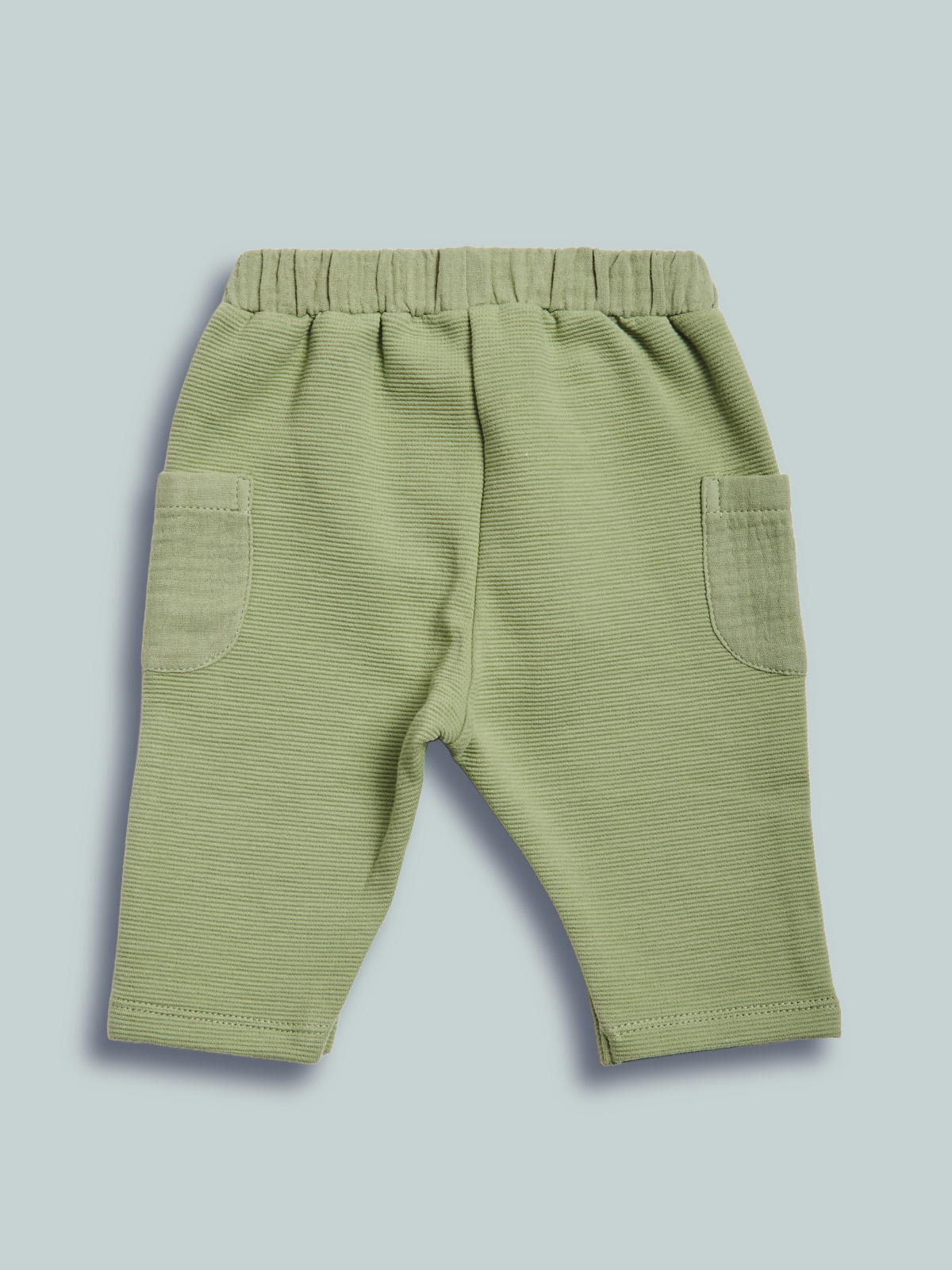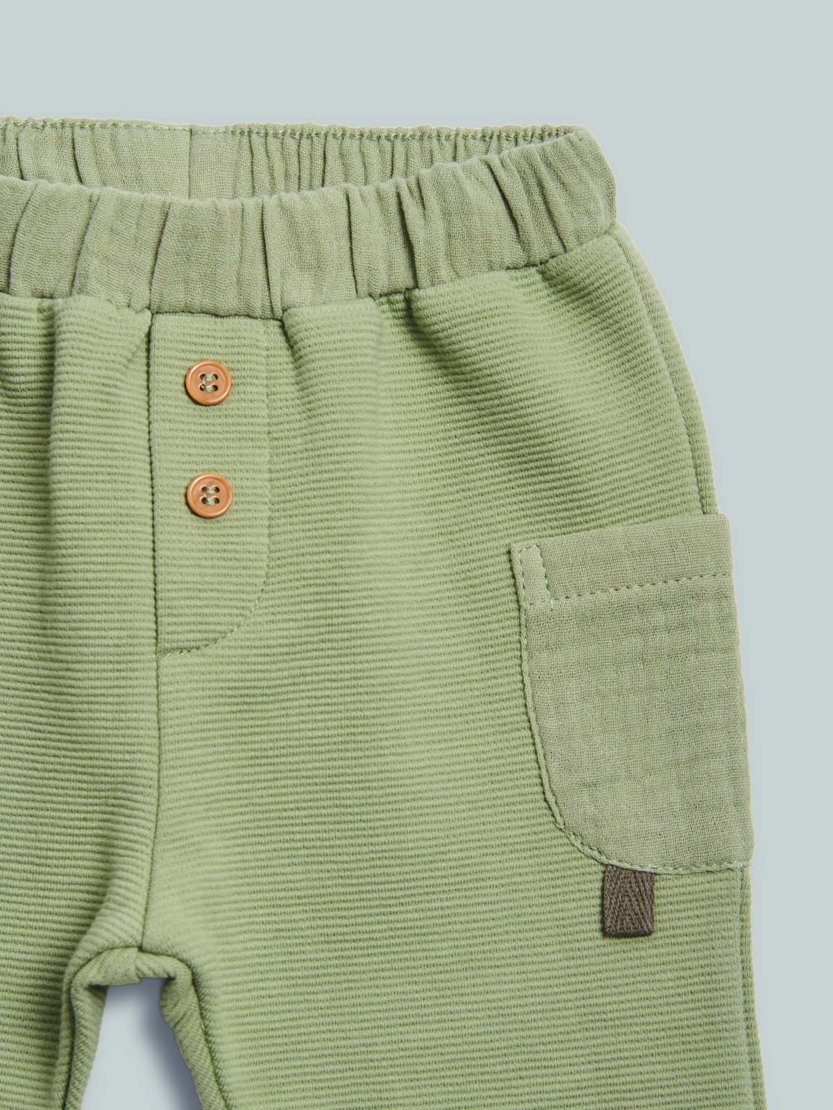 Pantaloni in morbido tubico riga a rilievo, vita elasticata e tasche applicate lateralmente in tessuto goffrato. Per outfit cool e quotidiano, senza rinunciare al comfort.
