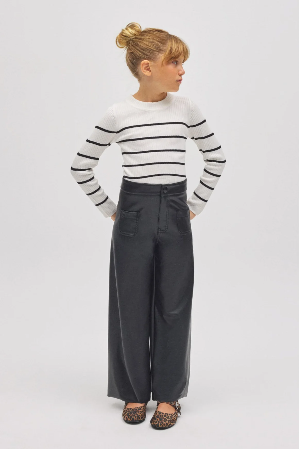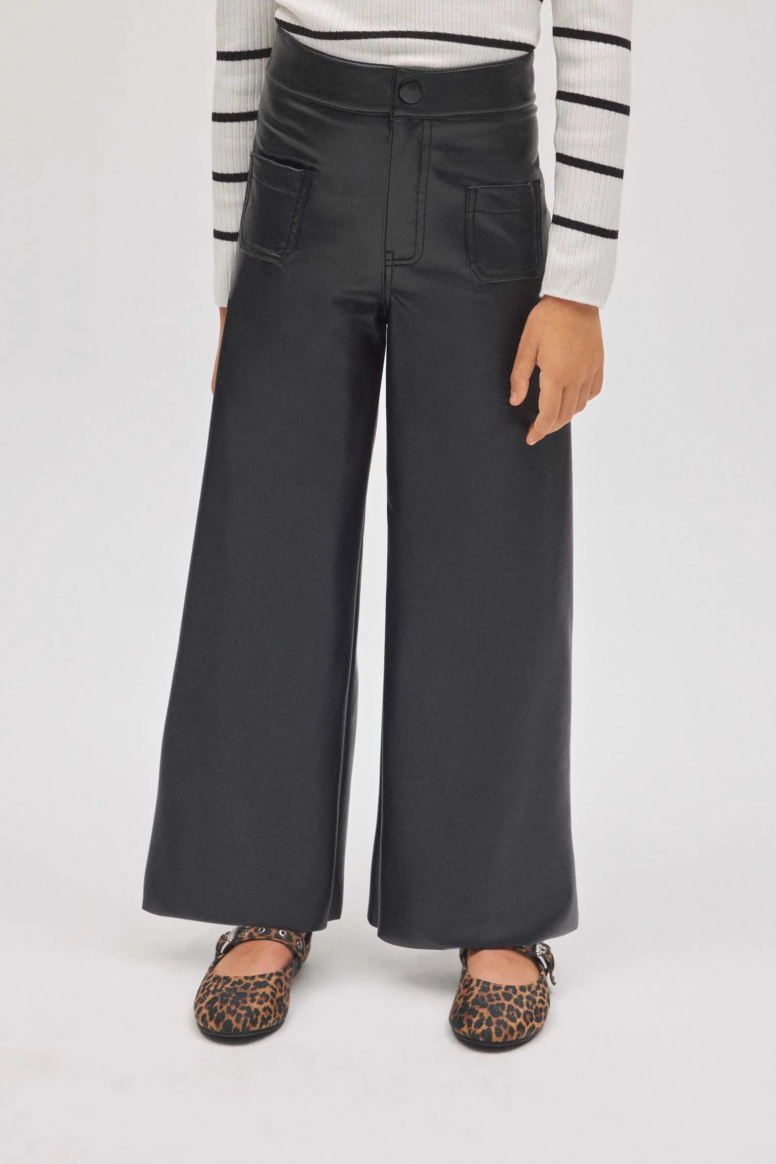 Pantaloni in similpelle a gamba larga con vita alta, perfetti per un look sofisticato senza rinunciare al comfort. L’interno in peluche offre una sensazione di calore e morbidezza, ideale per le giornate piรน fredde. Il design senza orlo inferiore con bottone nascosto e tasche posteriori offre una finitura pulita e moderna.