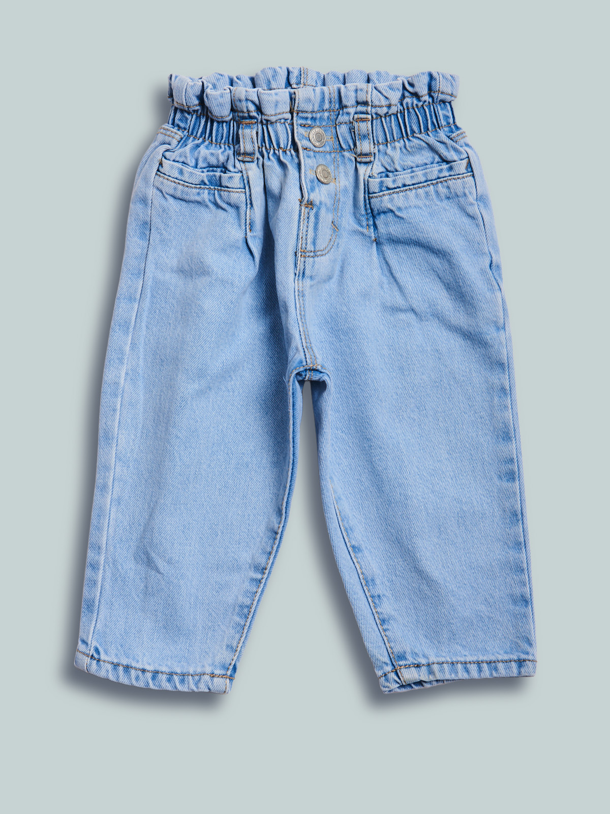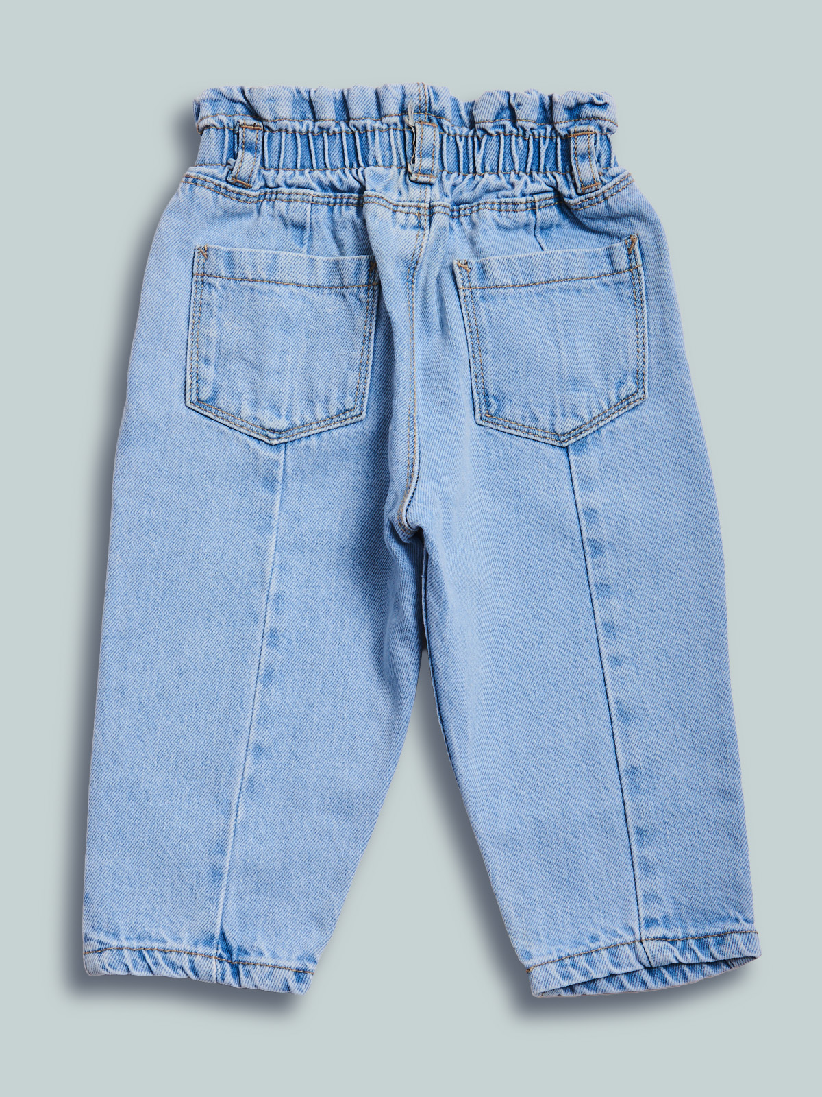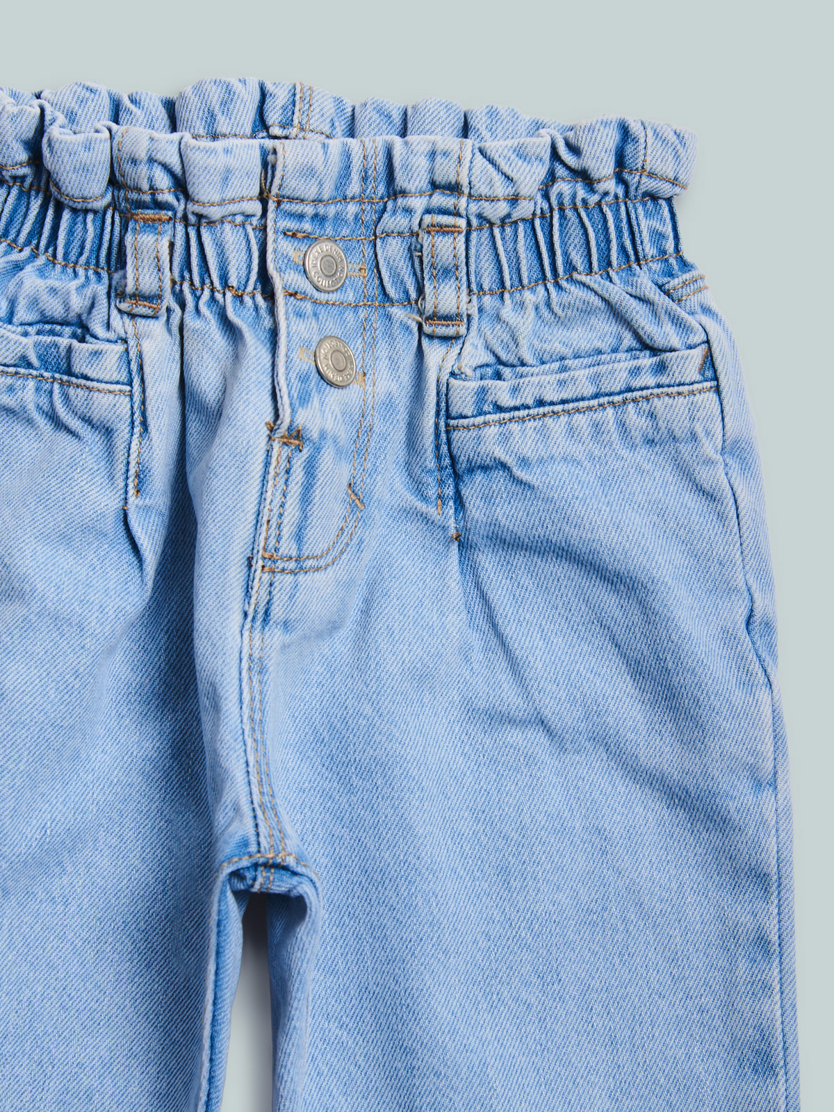 Pantaloni in morbido denim. Vita con elastico regolabile e apertura con bottone per maggiore comoditร . Vestibilitร paperbag. Un capo pratico e perfetto per essere sempre alla moda.