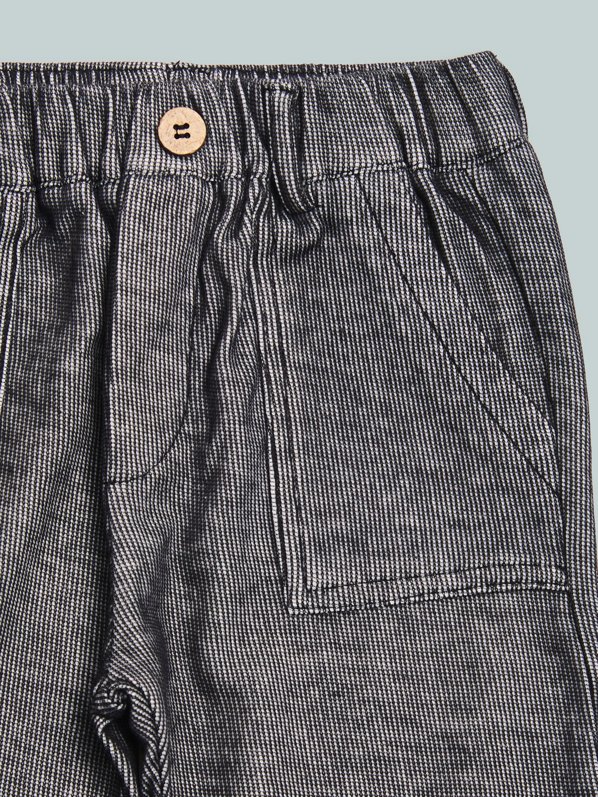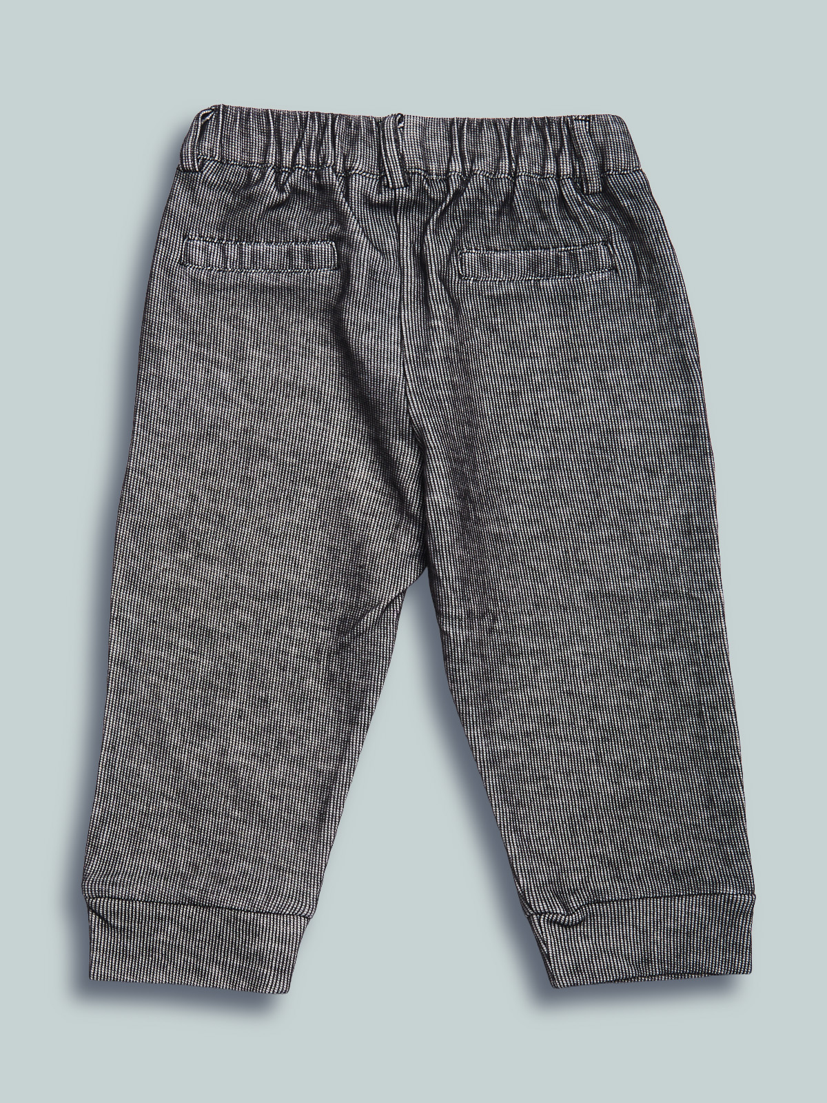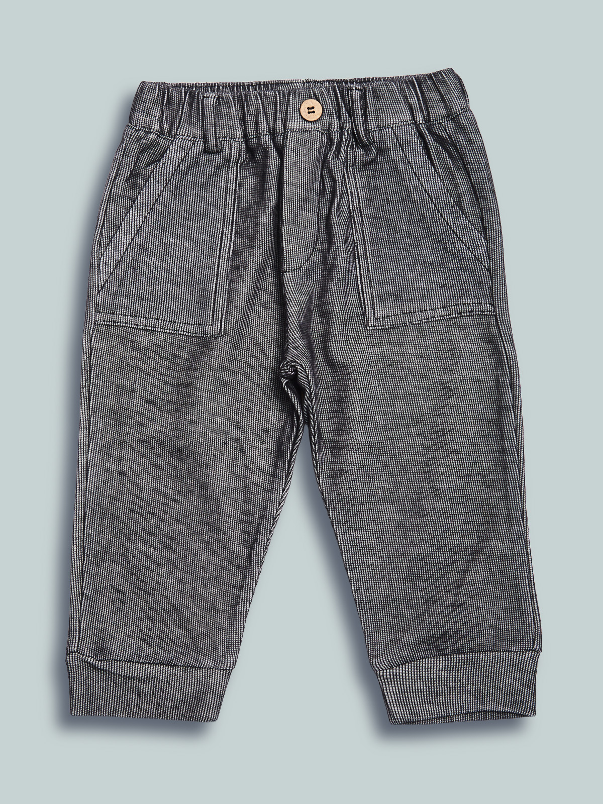 Pantaloni in tessuto maglia elasticizzato, modello con vita elasticata e finto bottone effetto legno, tasche applicate davanti e a filetto dietro. Un capo pratico e comodo per giocare in libertร .
