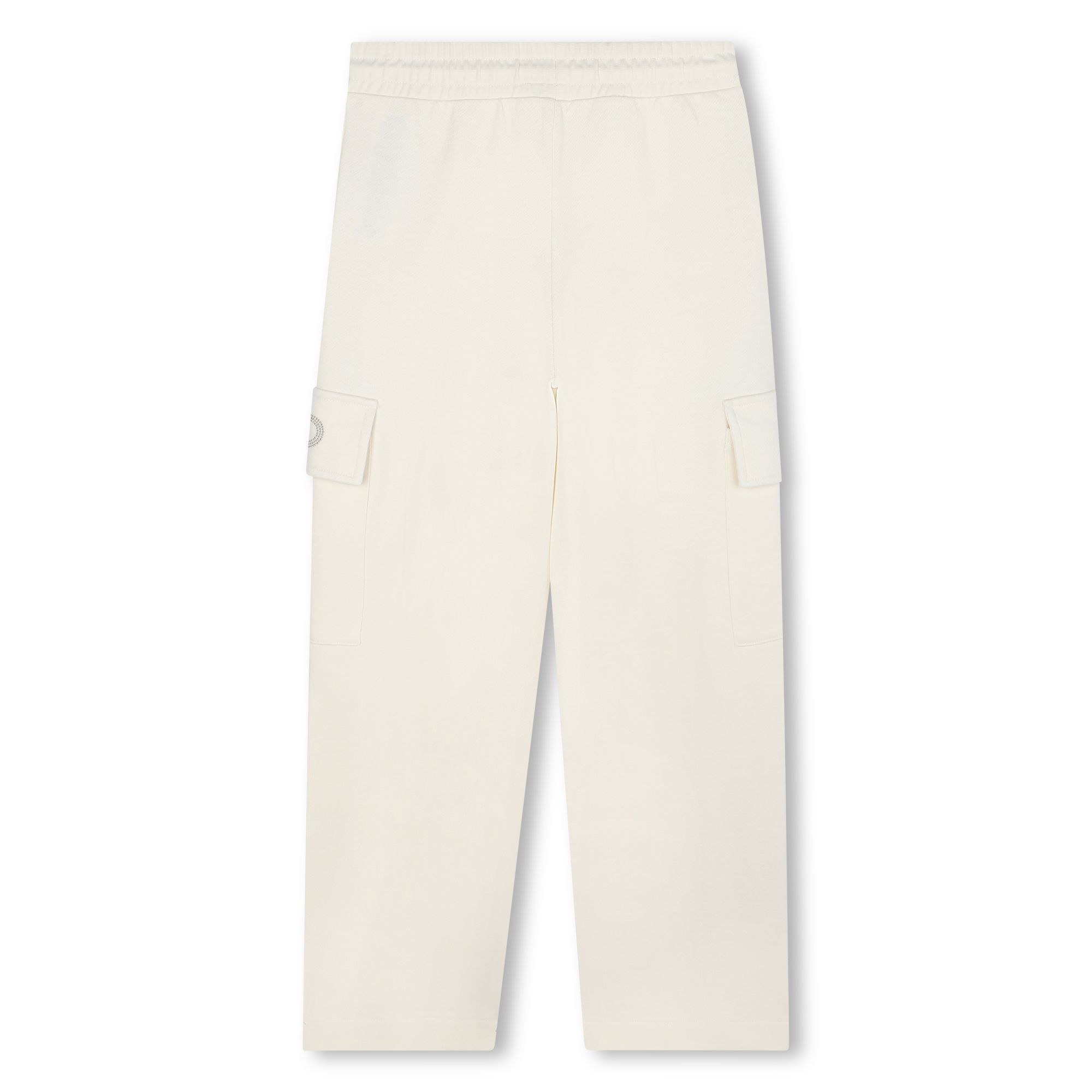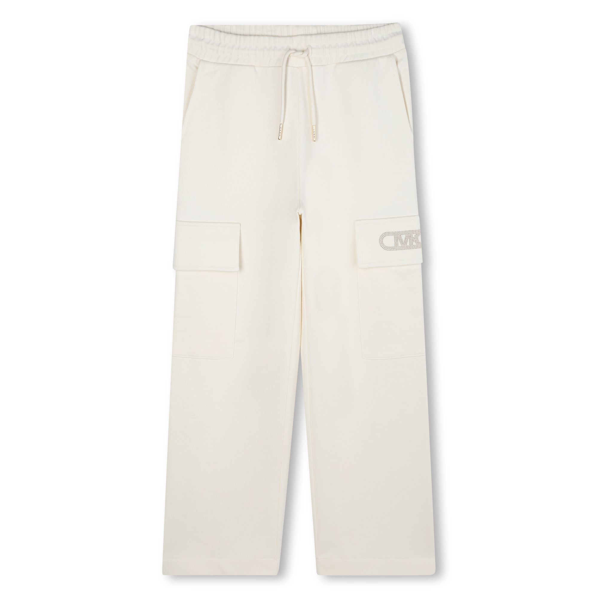Pantalone in morbido cotone colore bianco con elastico in vita, tasconi laterali con logo in oro applicato.