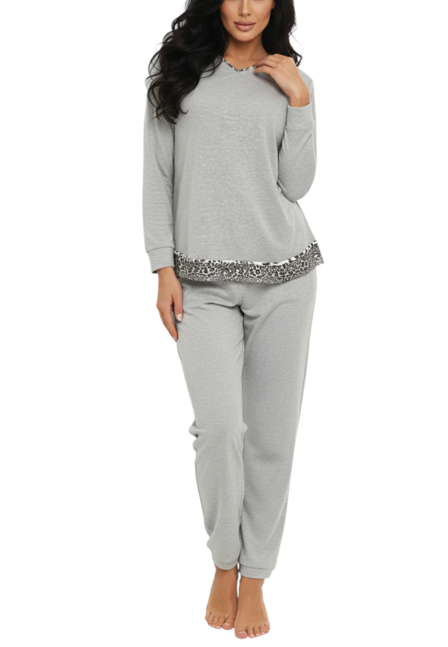 pigiama made in Italy in morbido interlock. Fondo grigio con rifiniture a contrasto in raso e pizzo. Scollo a cuore