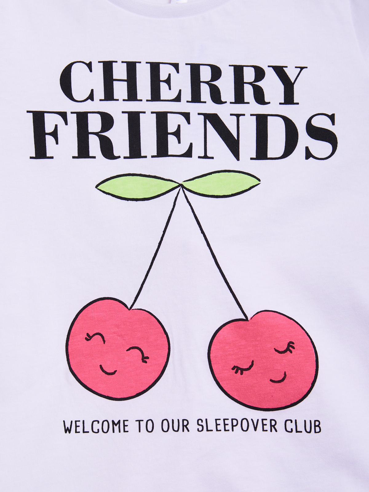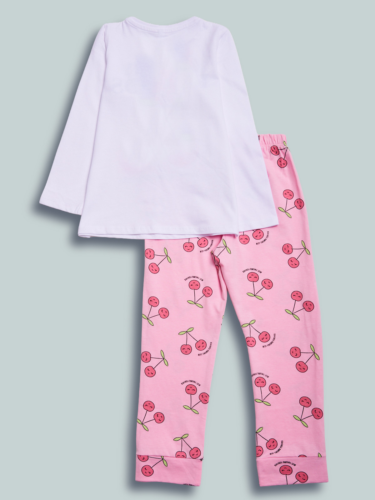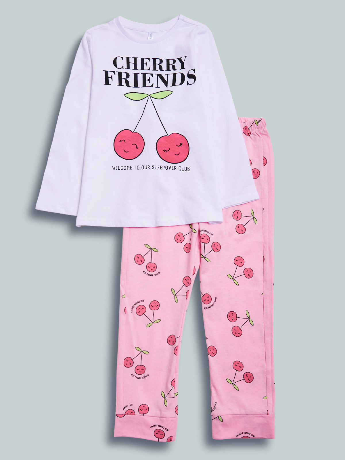 Pigiama due pezzi in morbido cotone. Tshirt manica lunga con simpatica scritta e ciliegie sul davanti. Pantaloni in fantasia ciliegie con vita elasticata per maggiore comoditร . Ideale da indossare nelle nottate primaverili, un capo morbido e comfortevole per fare dolci sogni.