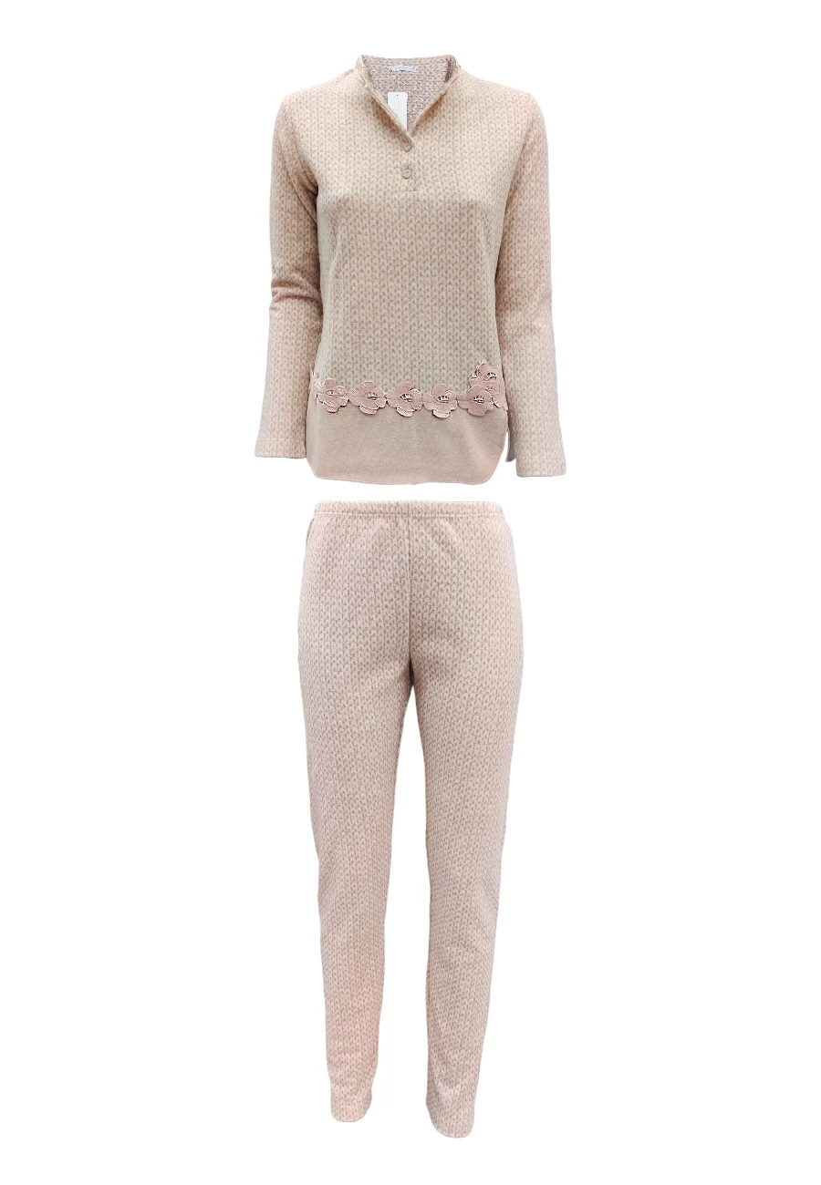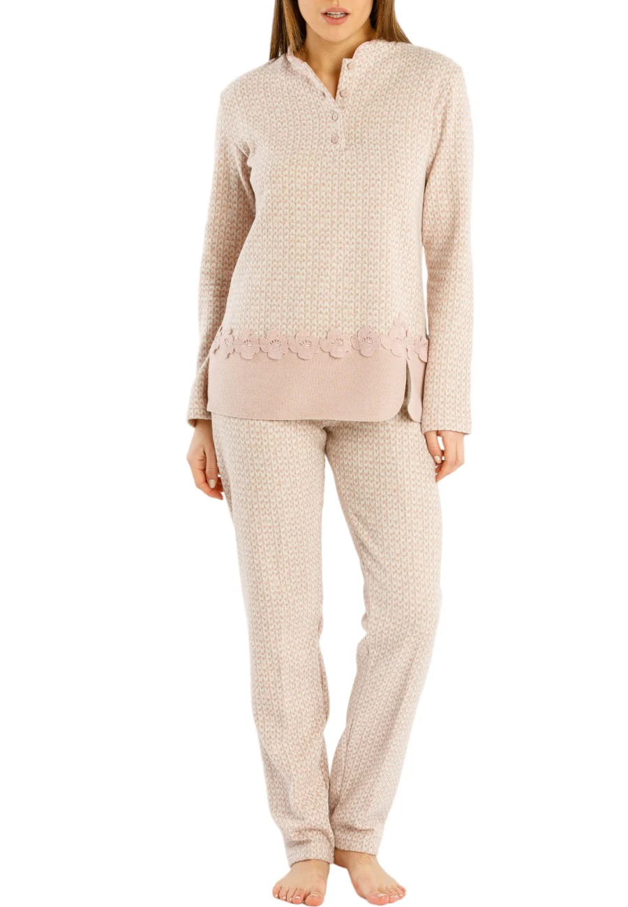 pigiama gamba e manica lunga in punto milano fantasia con ricami.