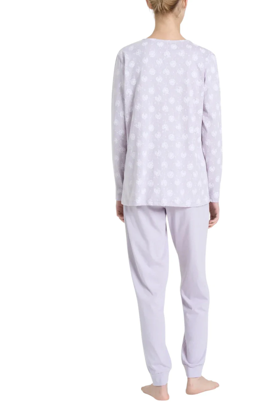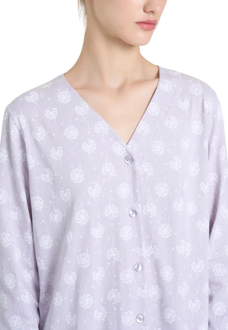 La stampa all-over con una delicata fantasia a soffioni aggiunge un tocco delicato e romantico, evocando la leggerezza dei petali trasportati dal vento e conferendo al design unโeleganza poetica. I polsini alle caviglie assicurano una vestibilitร ottimale e ulteriore praticitร nellโindosso per affrontare la notte nel relax piรน assoluto.