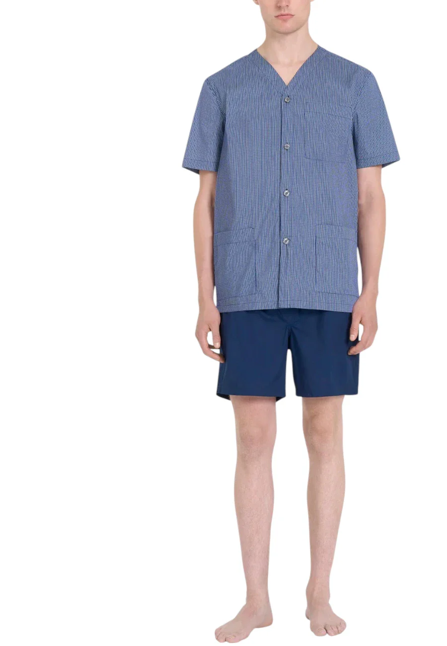 Pigiama corto in navetta di puro cotone tinto filo con camicia senza collo aperta con bottoni e tre tasche. I pantaloncini con taglio classico si adattano perfettamente alle calde temperature e donando una sensazione di freschezza e comfort eccezionale. Il tessuto in navetta di cotone รจ scelto per la sua morbidezza e comfort sulla pelle, garantendo una piacevole sensazione di freschezza. Dall’aspetto classico questo pigiama aperto da uomo con tasche รจ un capo confortevole e pratico, perfetto per il relax notturno o per i momenti di riposo a casa. Realizzato in jersey di cotone, tessuto leggero e versatile, perfetto per garantire benessere in ogni momento del riposo.