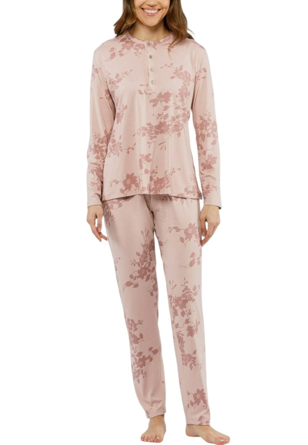 morbidissimo pigiama gamba e manica lunga in viscosa made in Italy. Maglia serafino fondo rosa con fantasia fiori in una tonalità più scura