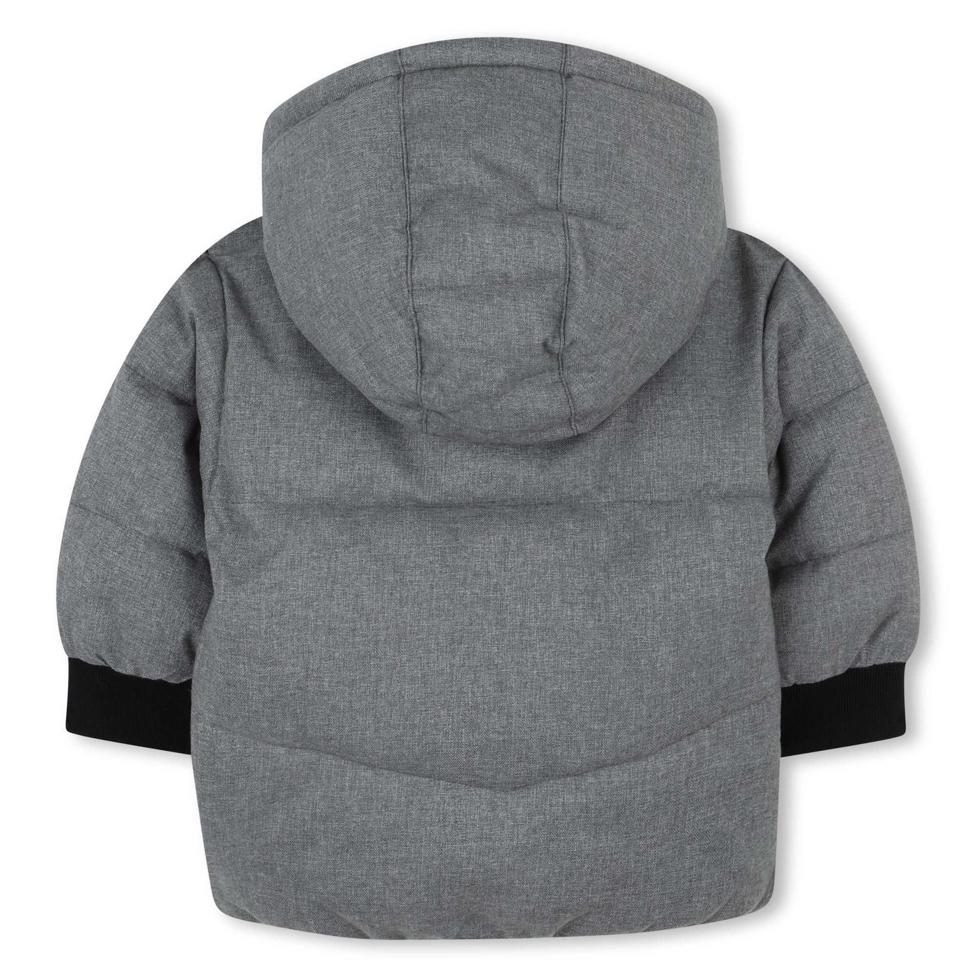 Piumino per bambino colore grigio in nylon con cappuccio fisso e tasche a filo.