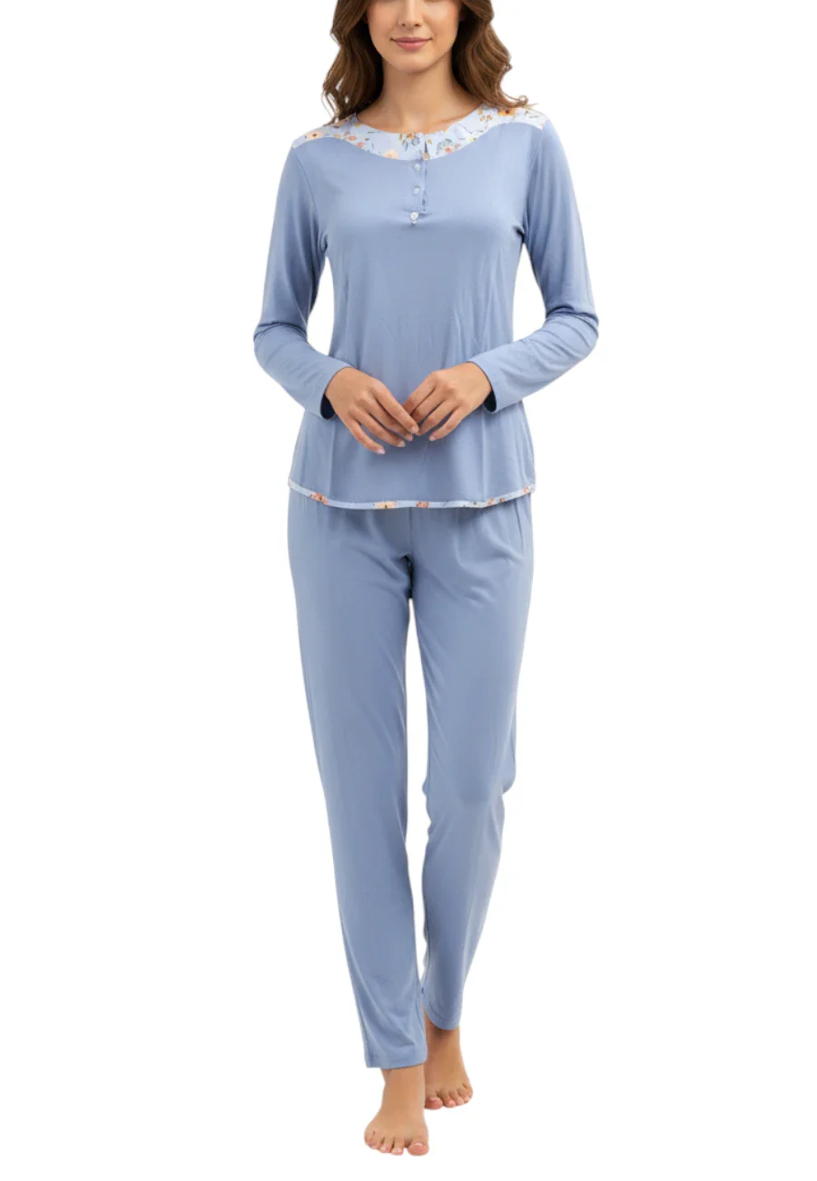 Pigiama Amadine lungo in leggerissima viscosa. Fondo azzurro e dettagli in raso con fantasia fiori.