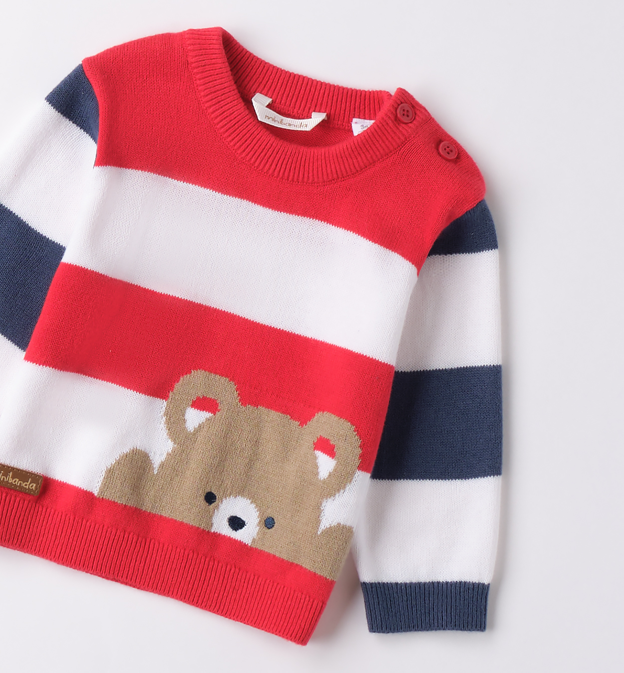 Pullover neonato Minibanda 1-24 mesi realizzato in tricot 100% cotone. Il modello presenta apertura sulla spalla e fantasia a righe con ricamo intarsio orsetto.