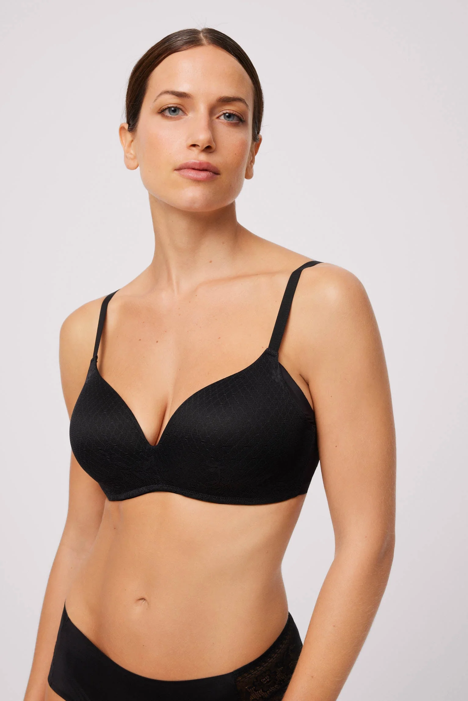 Collezione Special You. Reggiseno flessibile con ferretto e imbottitura. Coppe continue e delicata stampa in pizzo. Possibilitร di incrociare la schiena. Massimo comfort, versatilitร e design in un unico capo.