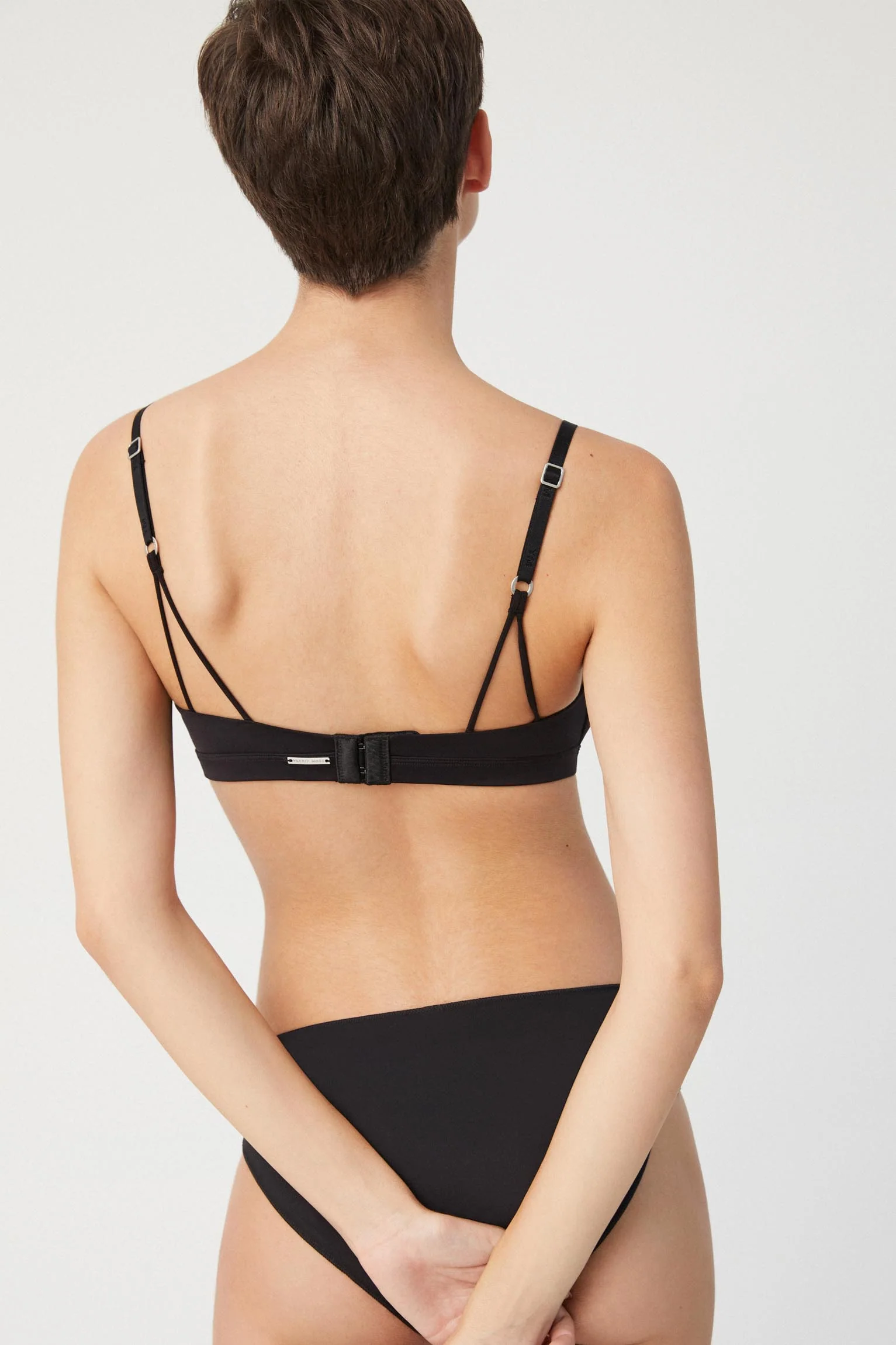 Nuova collezione Essentials. Reggiseno con chiusura interna foderata che impedisce gli sfregamenti. Coppe morbide a forma triangolare, senza ferretto e con imbottitura. Delicato dettaglio sulle spalline con doppia riga sul retro. Design e funzionalitร in un unico pezzo. Colore nero. 90% Poliammide, 10% Elastan