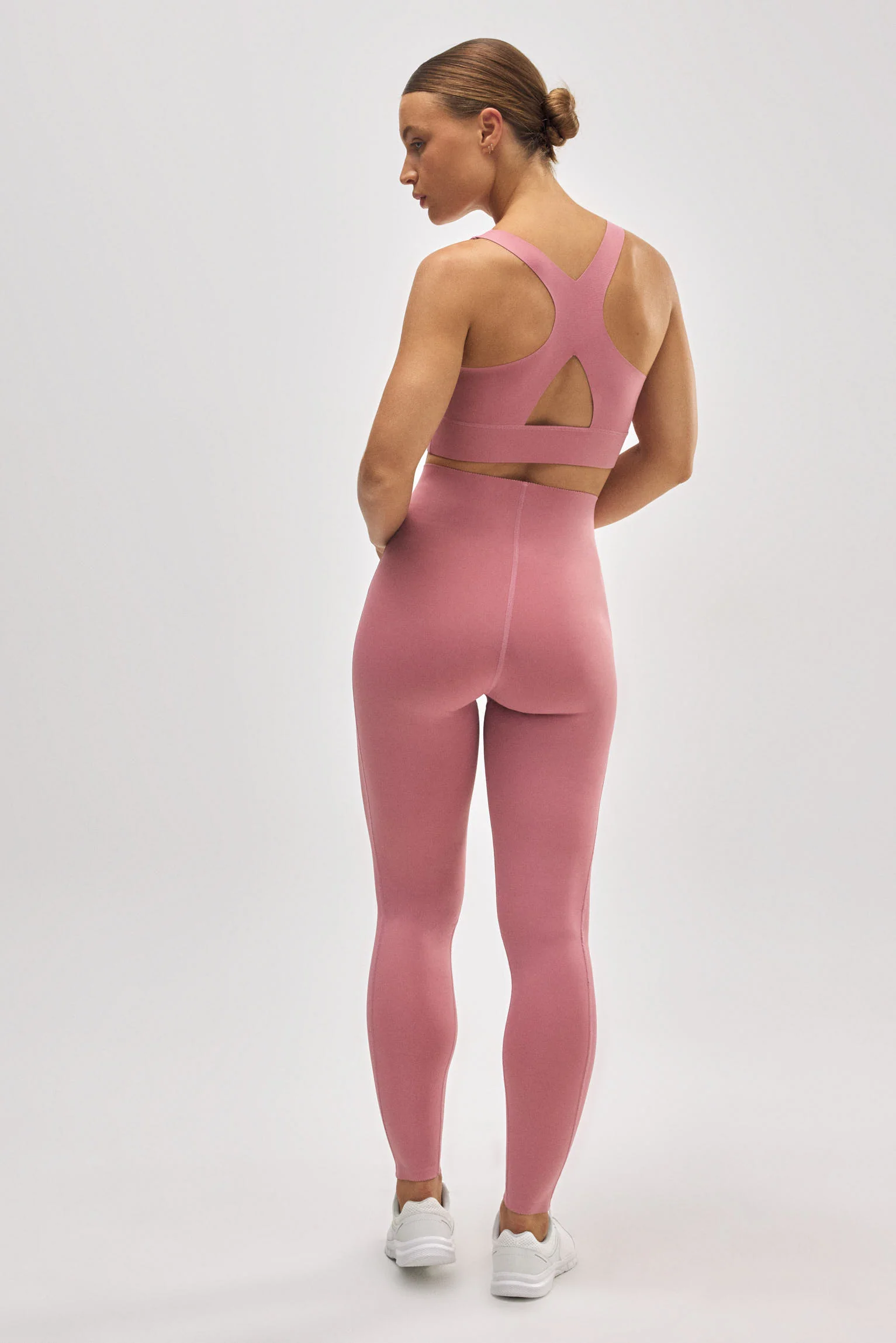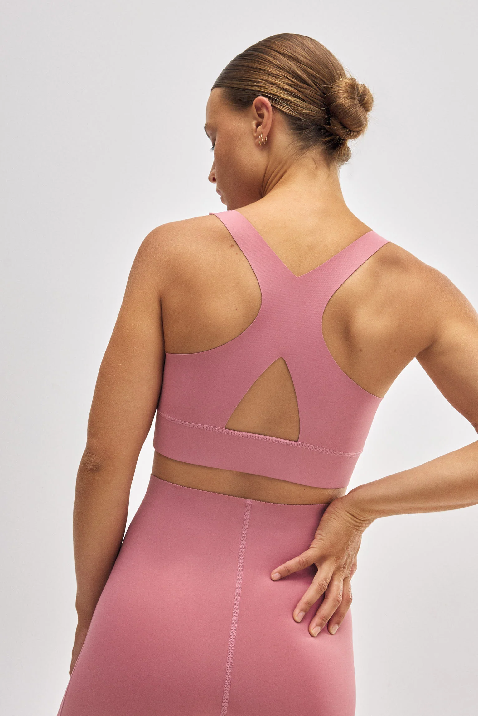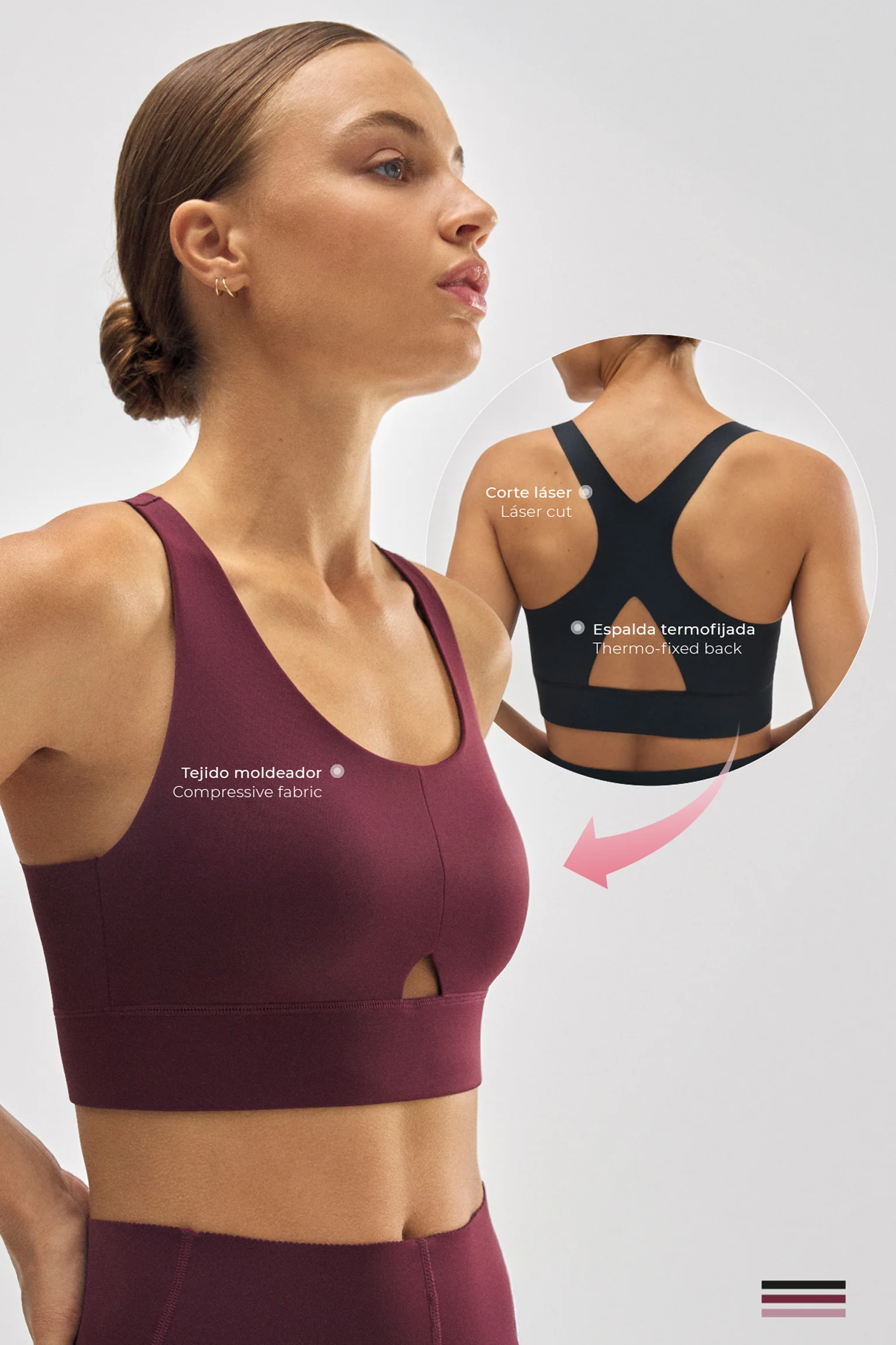 Reggiseno sportivo compressivo rosa con dettaglio di apertura