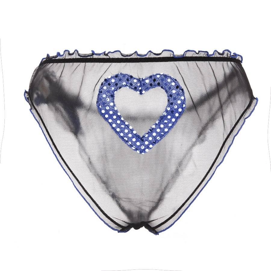 Slip da donna in tulle nero velato con dettagli blu in paillettes, cuore frontale e piccolo fiocco laterale. Elegante, sensuale e leggero. Taglia L.