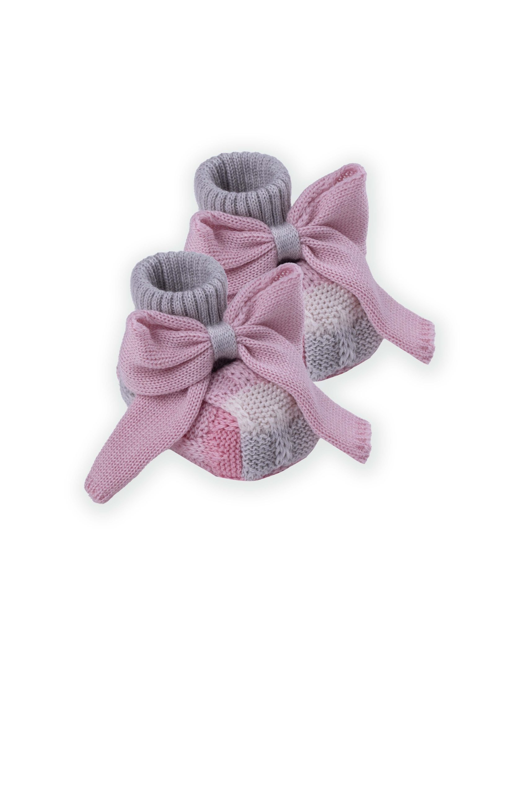 Scarpette in morbida lana con fiocco; bicolore rosa e marsala, ideale da abbinare alla tutina senza piedini IN2310-9961M.