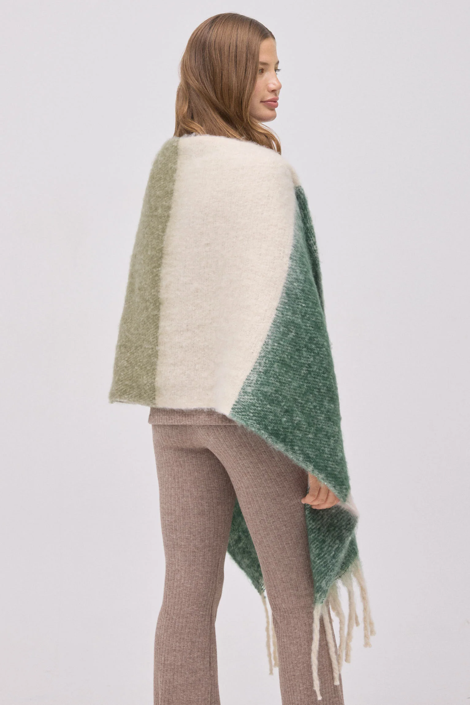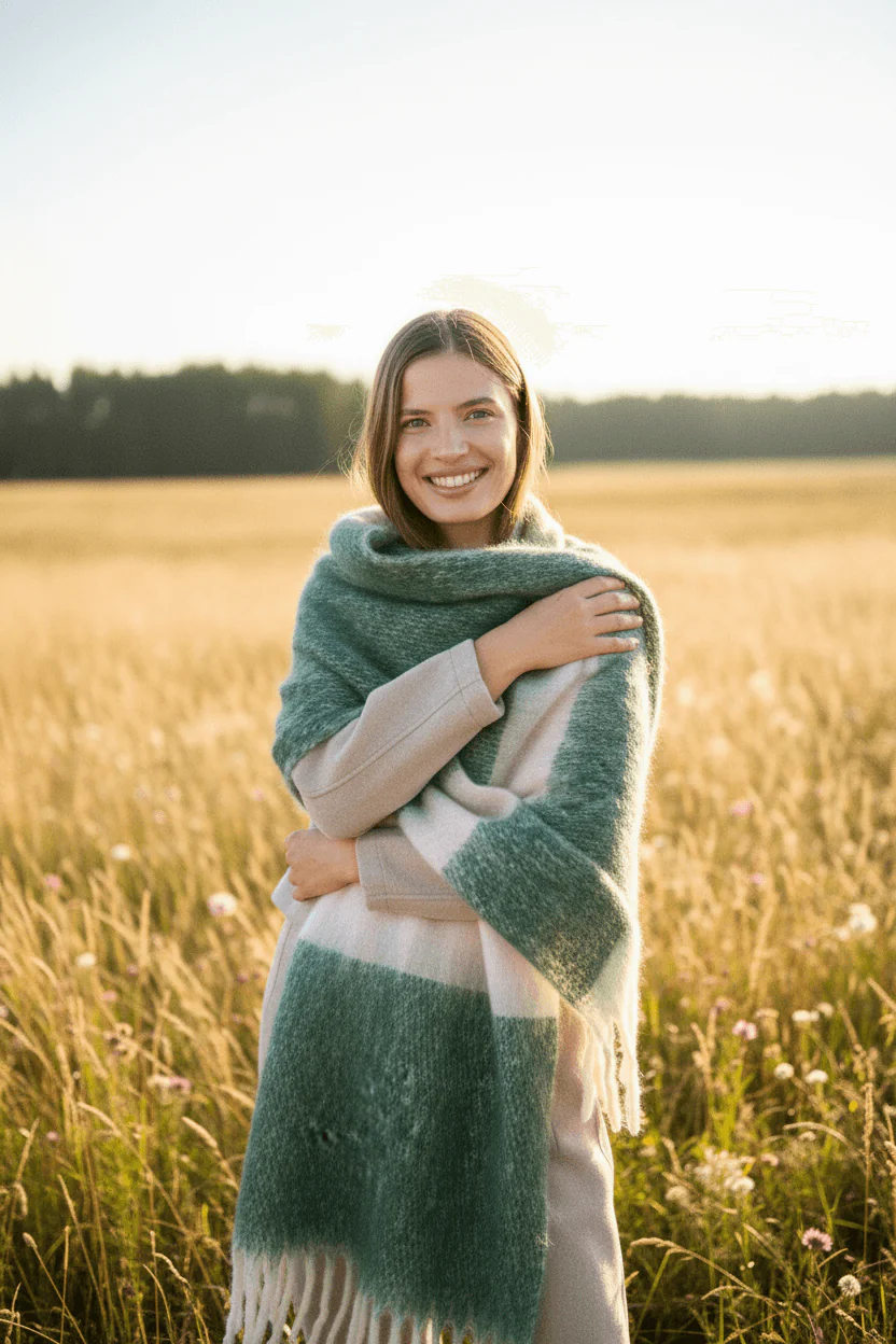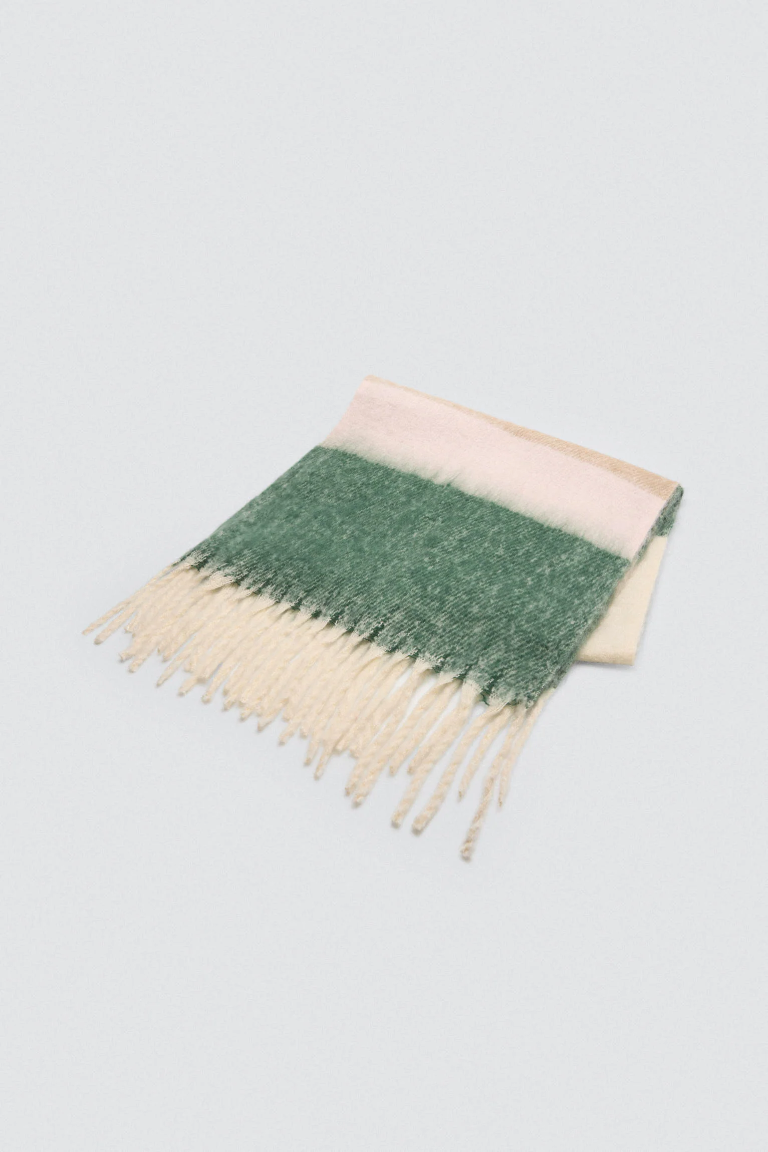 Sciarpa in stile pashmina con ampie strisce verdi e beige. Il suo design avvolgente e la consistenza soffice la rendono un capo essenziale per l’inverno.