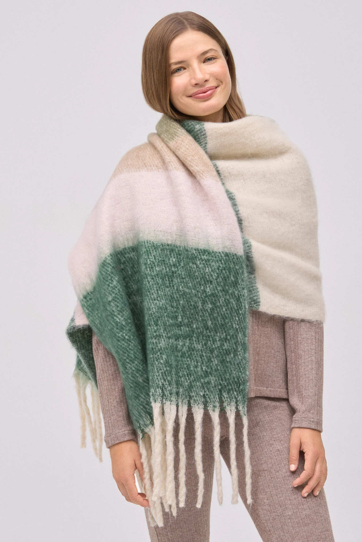 Sciarpa in stile pashmina con ampie strisce verdi e beige. Il suo design avvolgente e la consistenza soffice la rendono un capo essenziale per l’inverno. 100% poliestere