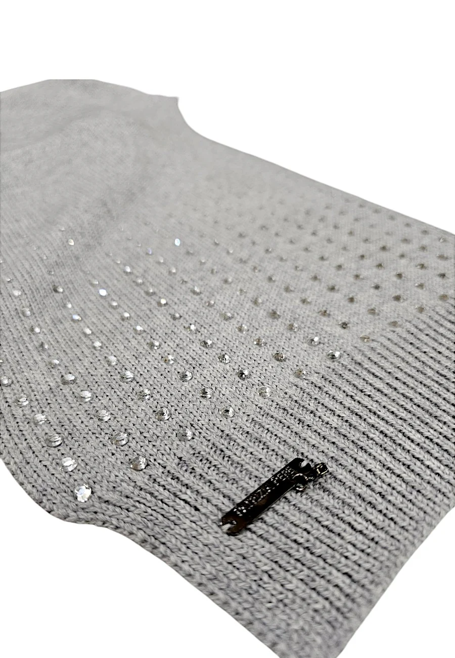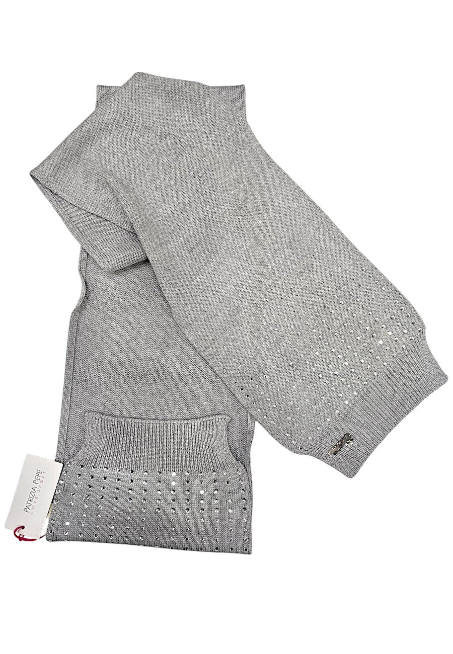 Sciarpa Patrizia Pepe in pregiato misto lana , Fondo grigio con strass alle estremitร  e targhetta in metallo.
