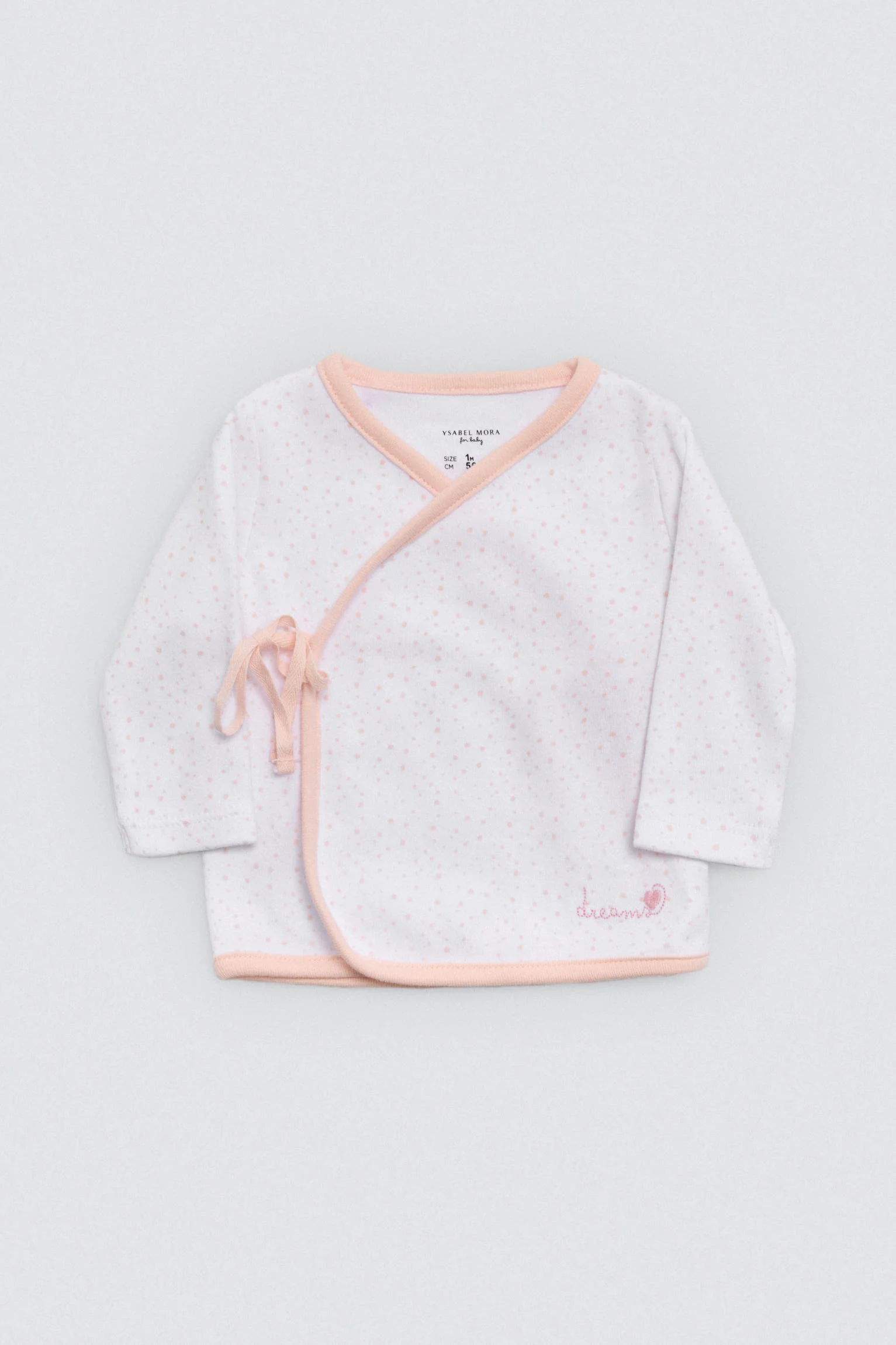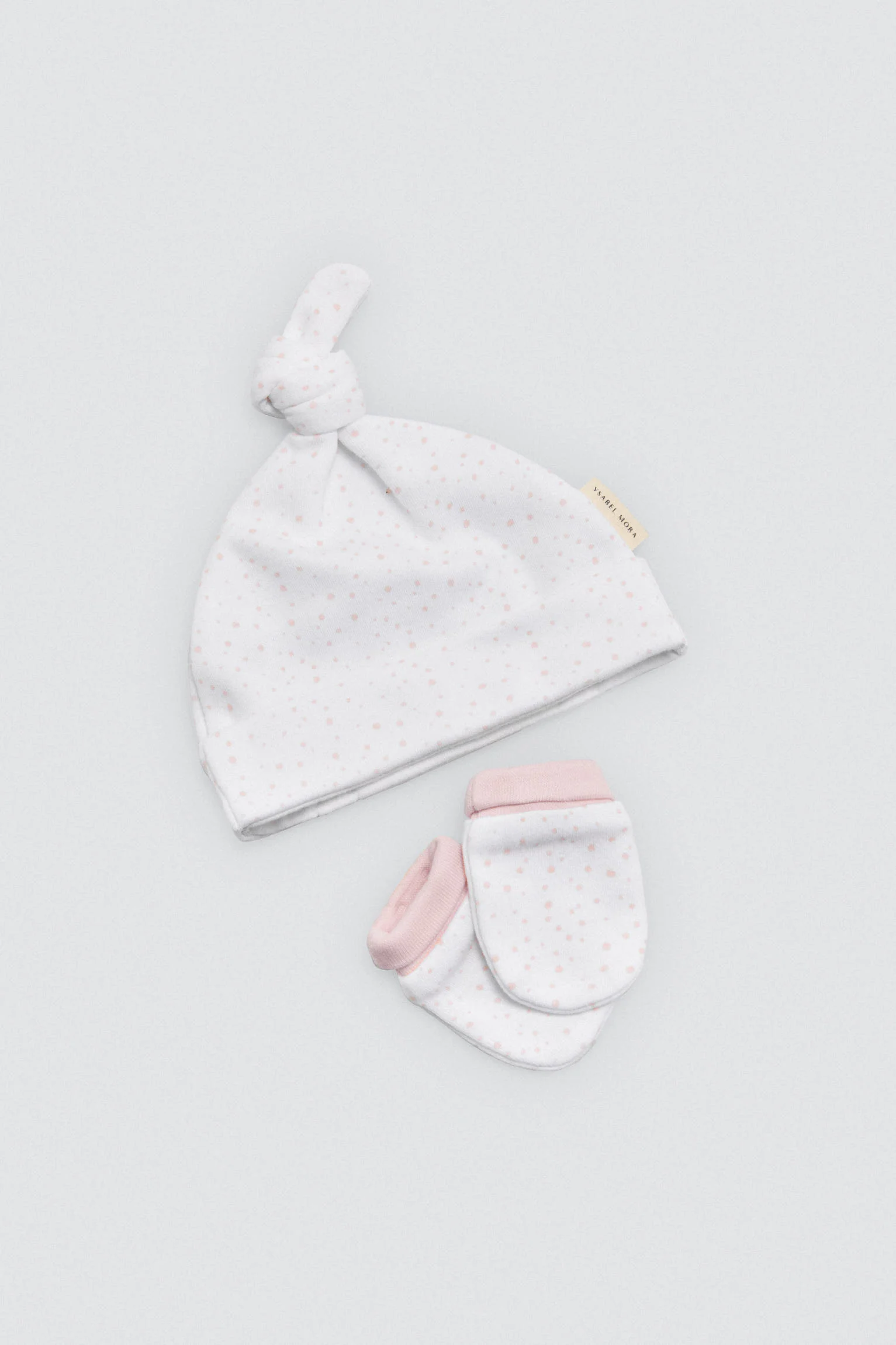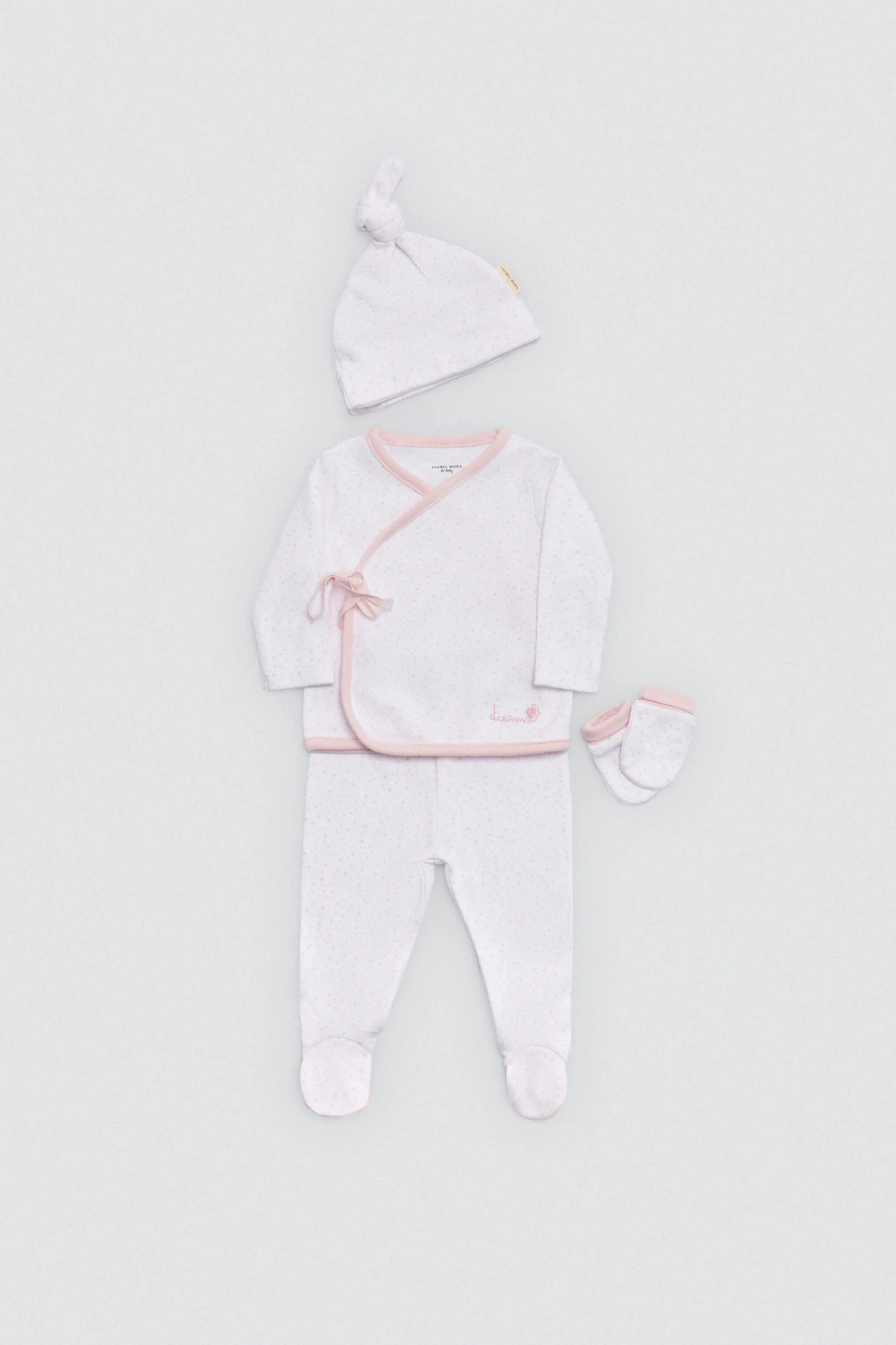 Set di primi vestiti per neonata. Include un top avvolgente, leggings, un berretto annodato e guanti. Tessuto in cotone 100% naturale, studiato per la pelle sensibile dei neonati. Un regalo imperdibile per il corredino. 100% cotone
