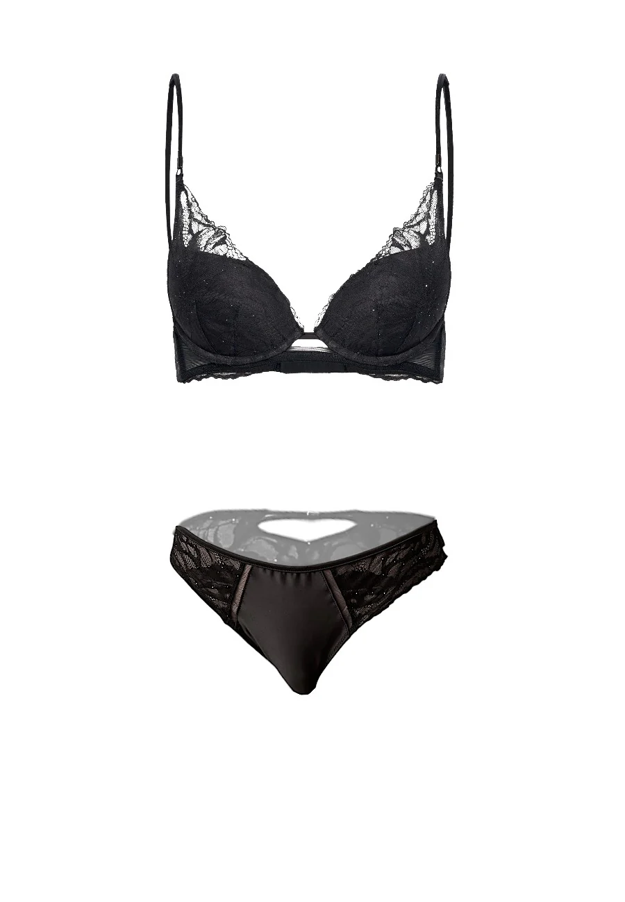 CK BLACK รจ la lussuosa gamma di biancheria intima irresistibilmente femminile. Le piccole paillettes argentate cucite sul pizzo conferiscono a questo reggiseno push-up una finitura brillante. Reggiseno con scollatura profonda e coppe push-up imbottite con ferretto. Spalline regolabili con doppio cordoncino e chiusura con gancetto sul retro. Slip con dettaglio posteriore cut out e ricami decorativi in rilievo.