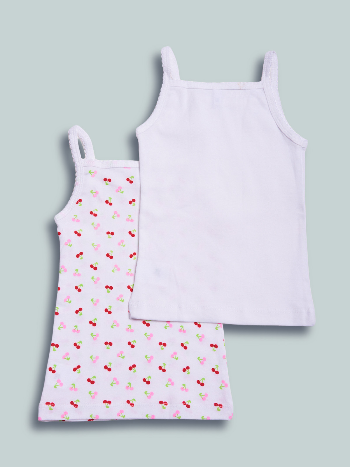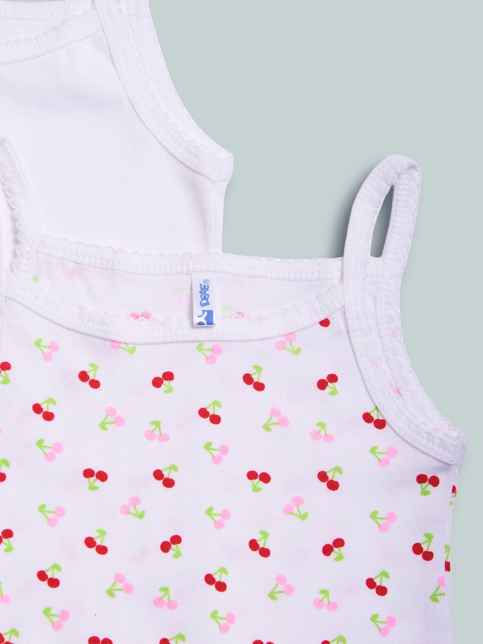 Set intimo composto da due canotte in morbido cotone, uno bianco e uno in fantasia ciliegine. Un capo intimo essenziale, adatto da abbinare agli slip della collezione.