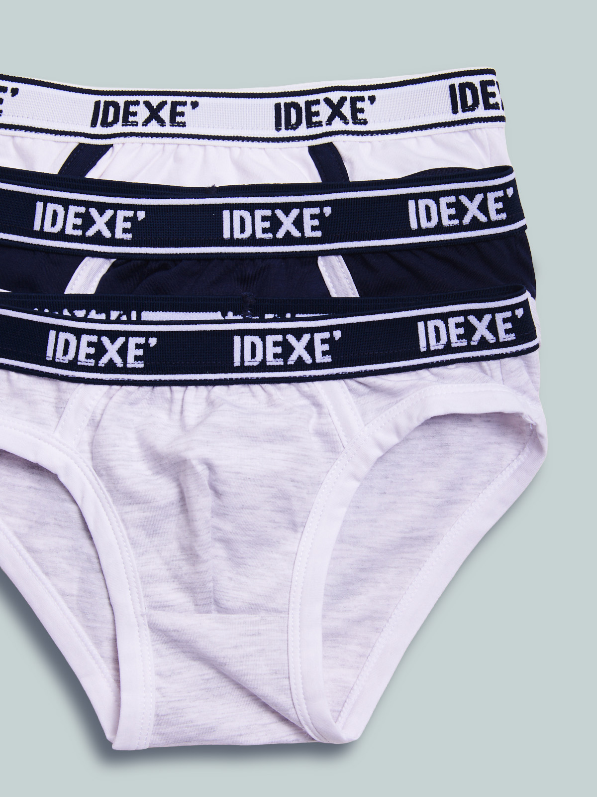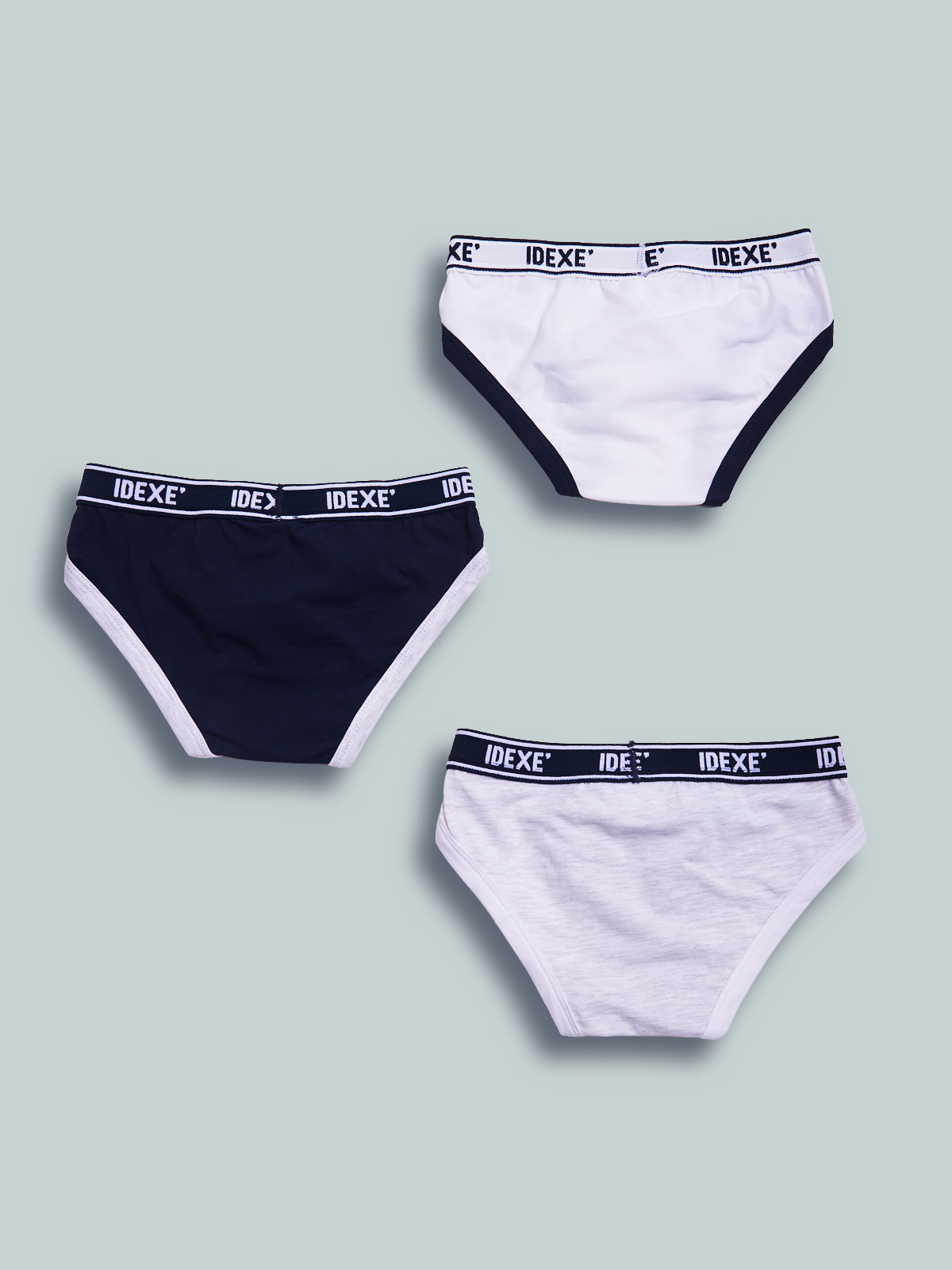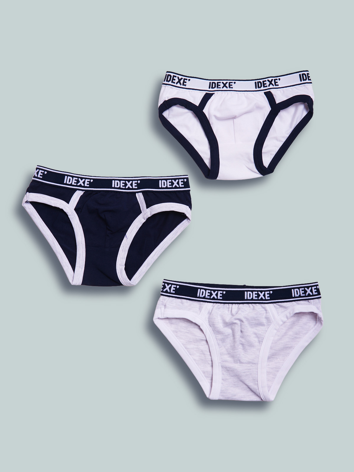 Set composto da tre slip in cotone elasticizzato, morbido e confortevole. In tre varianti con profili in contrasto ed elastico a vita personalizzato con logo. Un capo intimo essenziale, adatto da abbinare alle canotte della collezione.