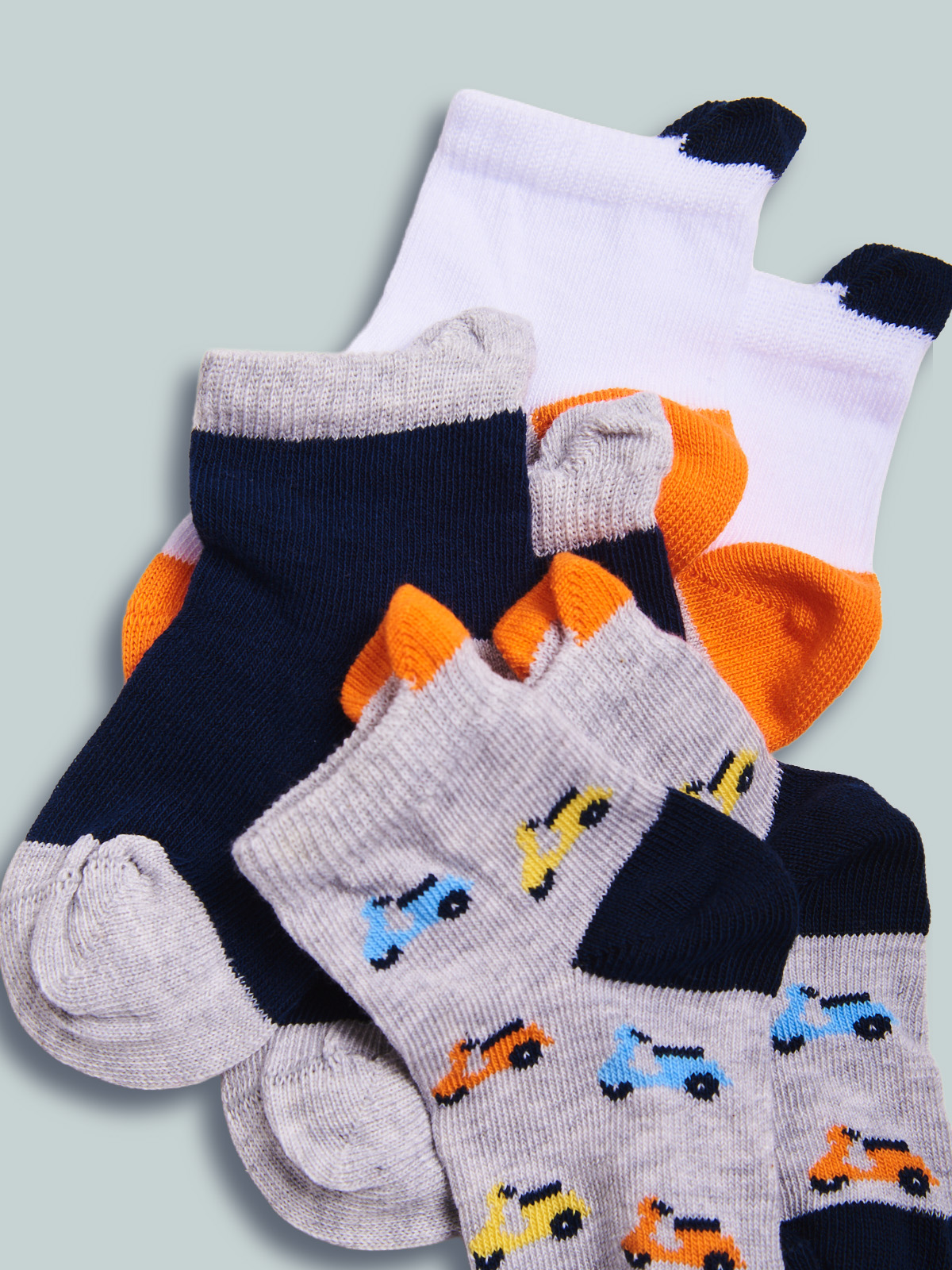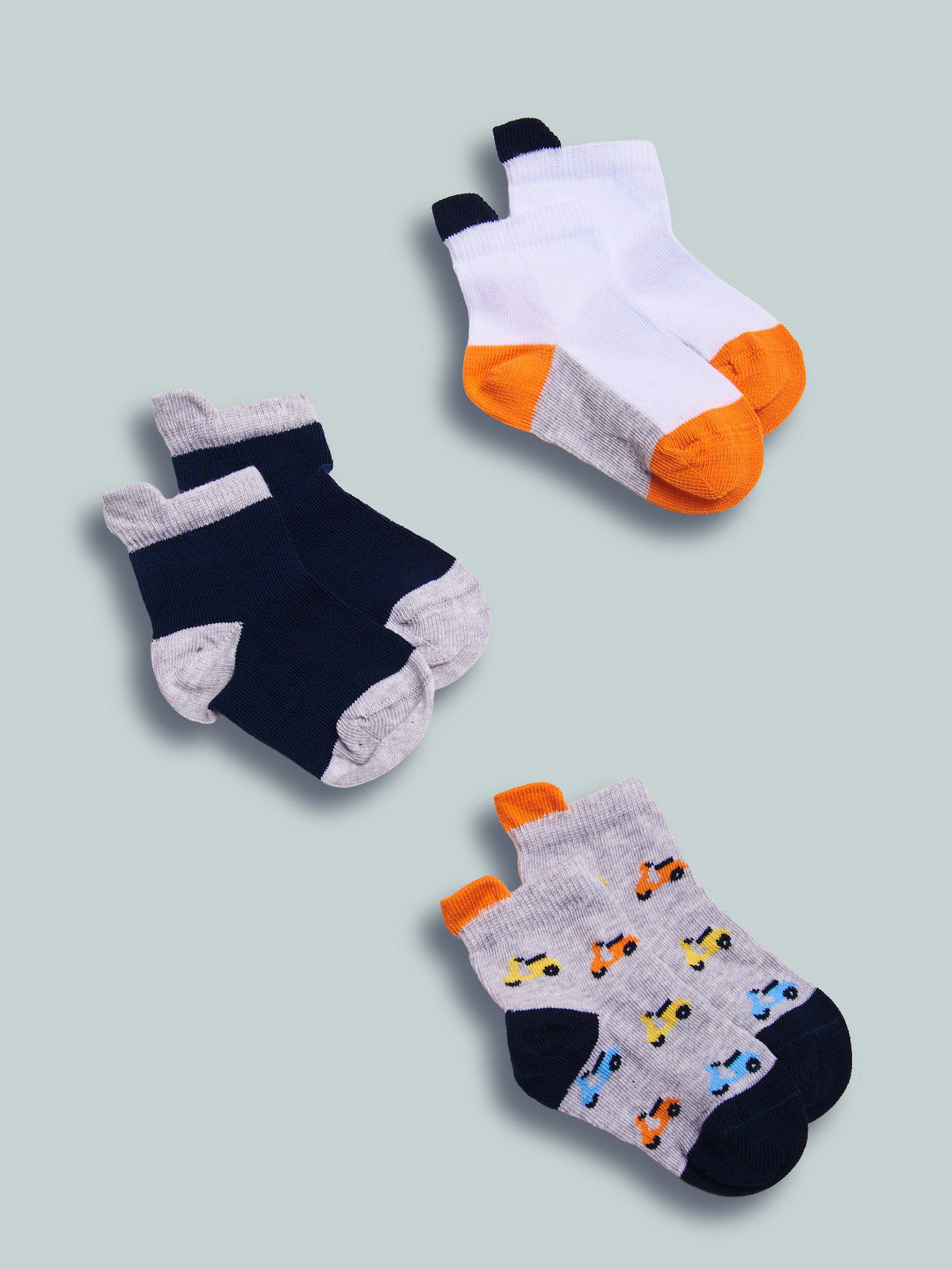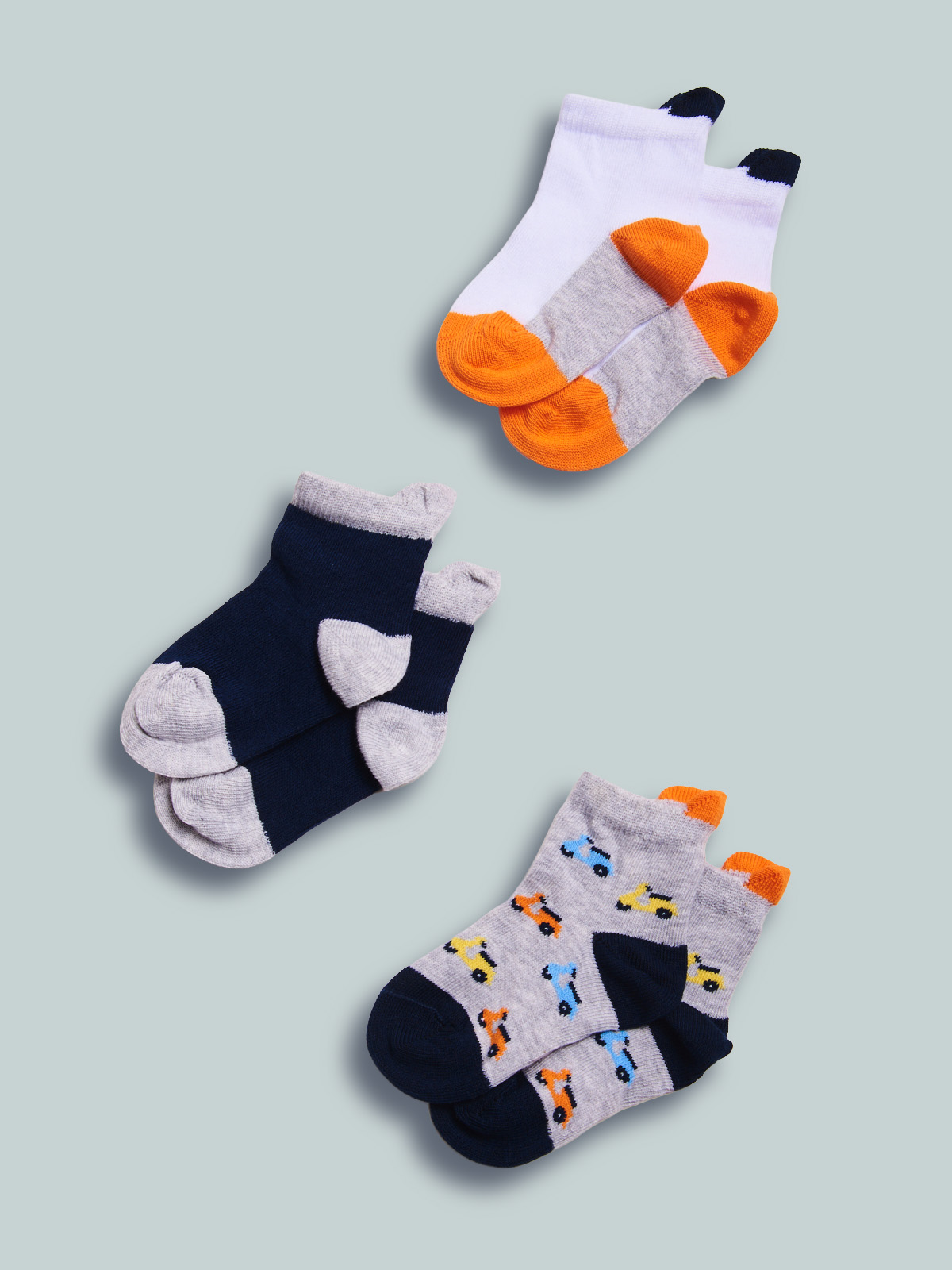 Set tre paia di calzini in morbido misto cotone. In fantasia o unite, con inserto tridimensionale sul retro della caviglia. Tre proposte differenti da abbinare in base al look della giornata.