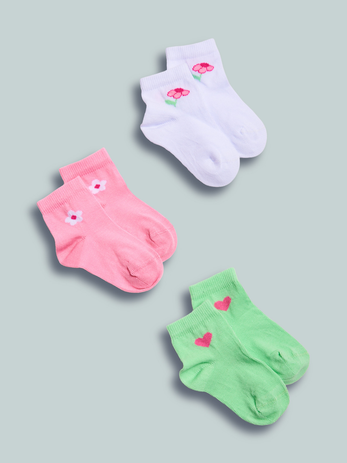 Calzini corti in morbido misto cotone. Tre varianti colore: bianco con fiorellino, rosa con fiorellino, verde con cuore. In un unico acquisto avrete tre proposte colorate e alla moda!