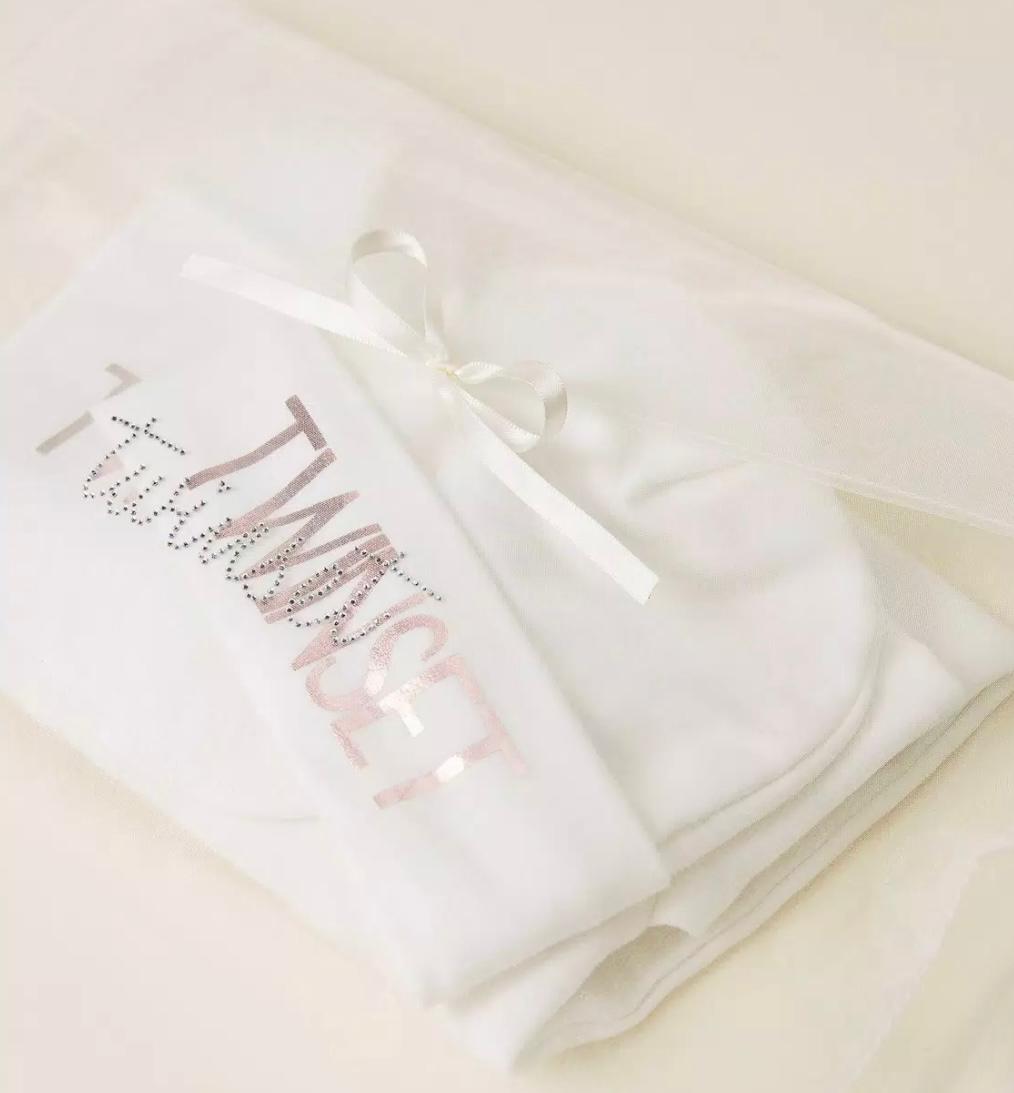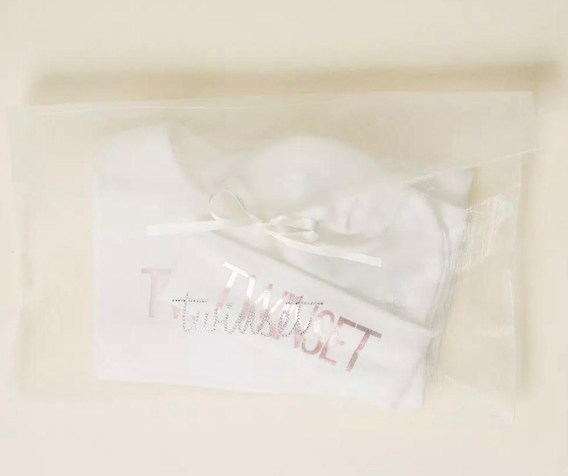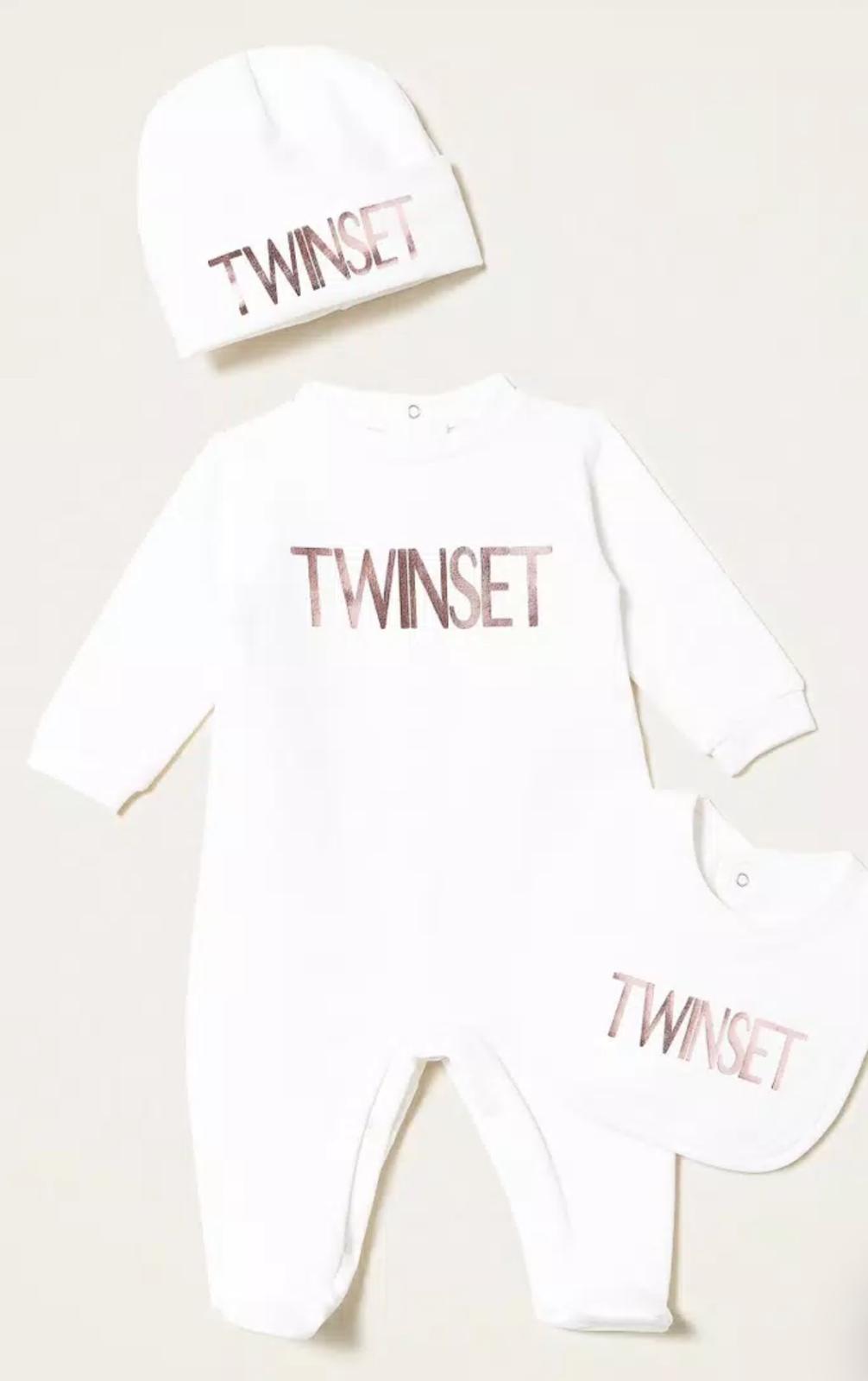 Set neonata in felpa leggera di cotone mano calda con logo, composto da tutina, berretto e bavaglino. Confortevole, ricercato, di stile. ร il set coordinato made in Italy da neonata in felpaย di cotone mano calda, personalizzato dal logo a stampa laminata, composto da tutina con bottoni piatti a pressione sul retro, berretto e bavaglino. Perfetto come idea regalo, รจ consegnato in busta di organza con chiusura a fiocco e logo Twinset in strass.