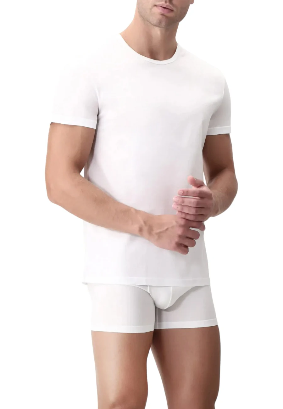 Maglietta girocollo da uomo realizzato nel piรน pregiato dei tessuti per l’intimo, il Filo di Scozia. Brillantezza, dispersione naturale della traspirazione cutanea e resistenza nel tempo caratterizzano questo tessuto.