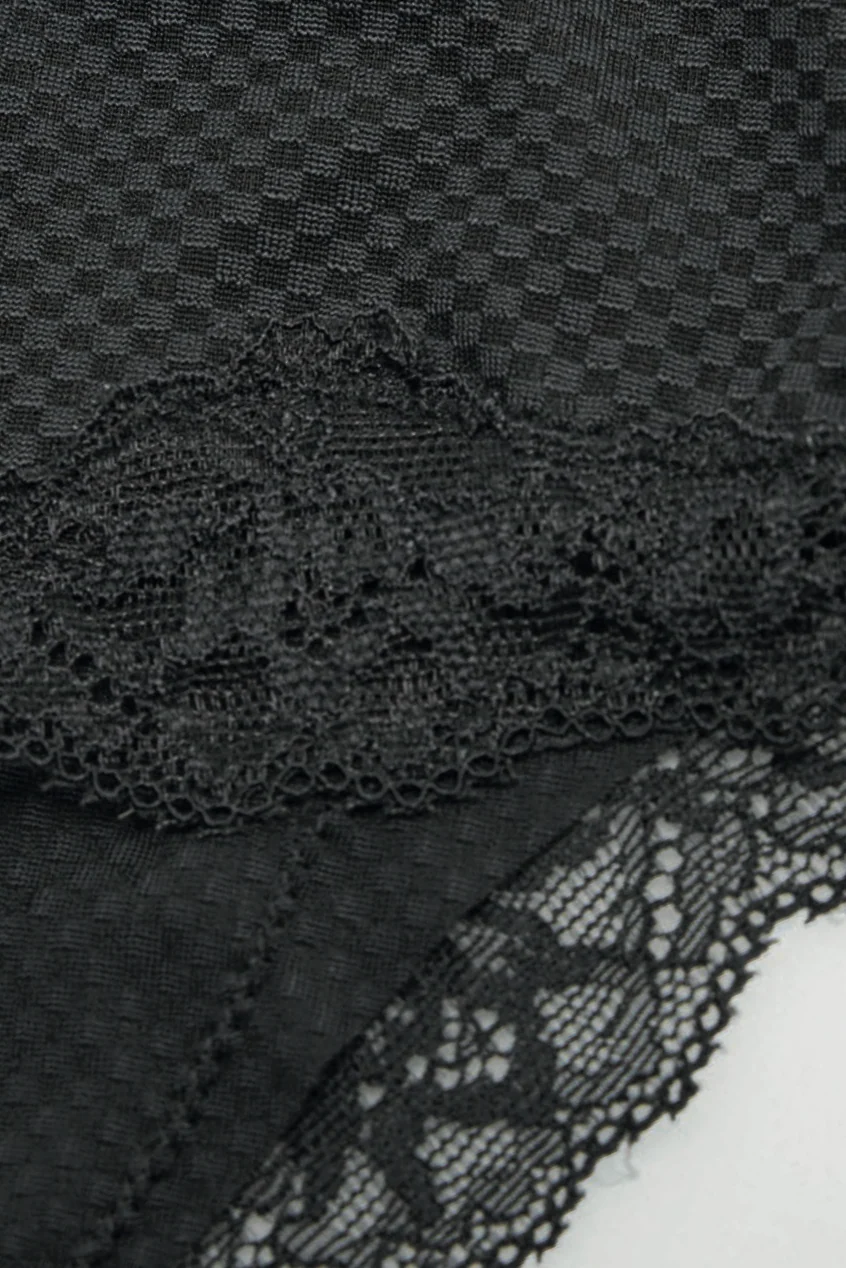 Per motivi igienici, questo prodotto non รจ restituibile. Slip intimo midi a copertura totale, nero. Tessuto jacquard a quadri con delicato bordo in pizzo. 82% Poliammide, 18% Elastan