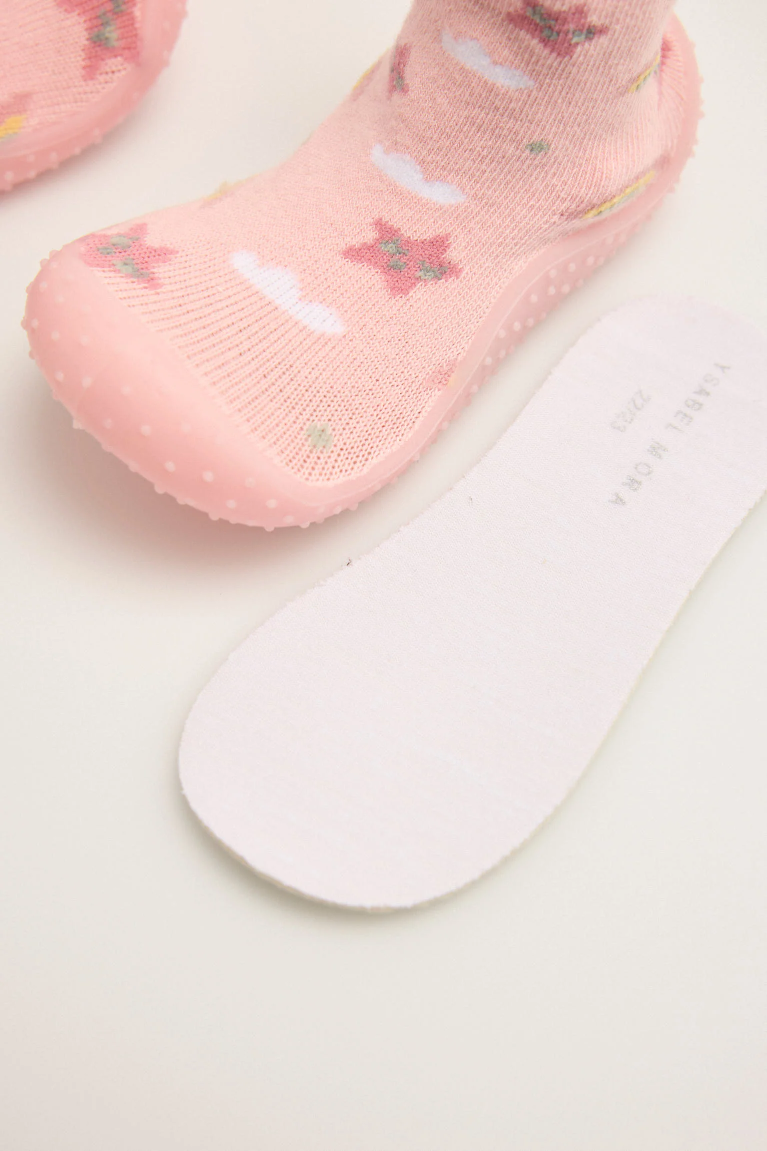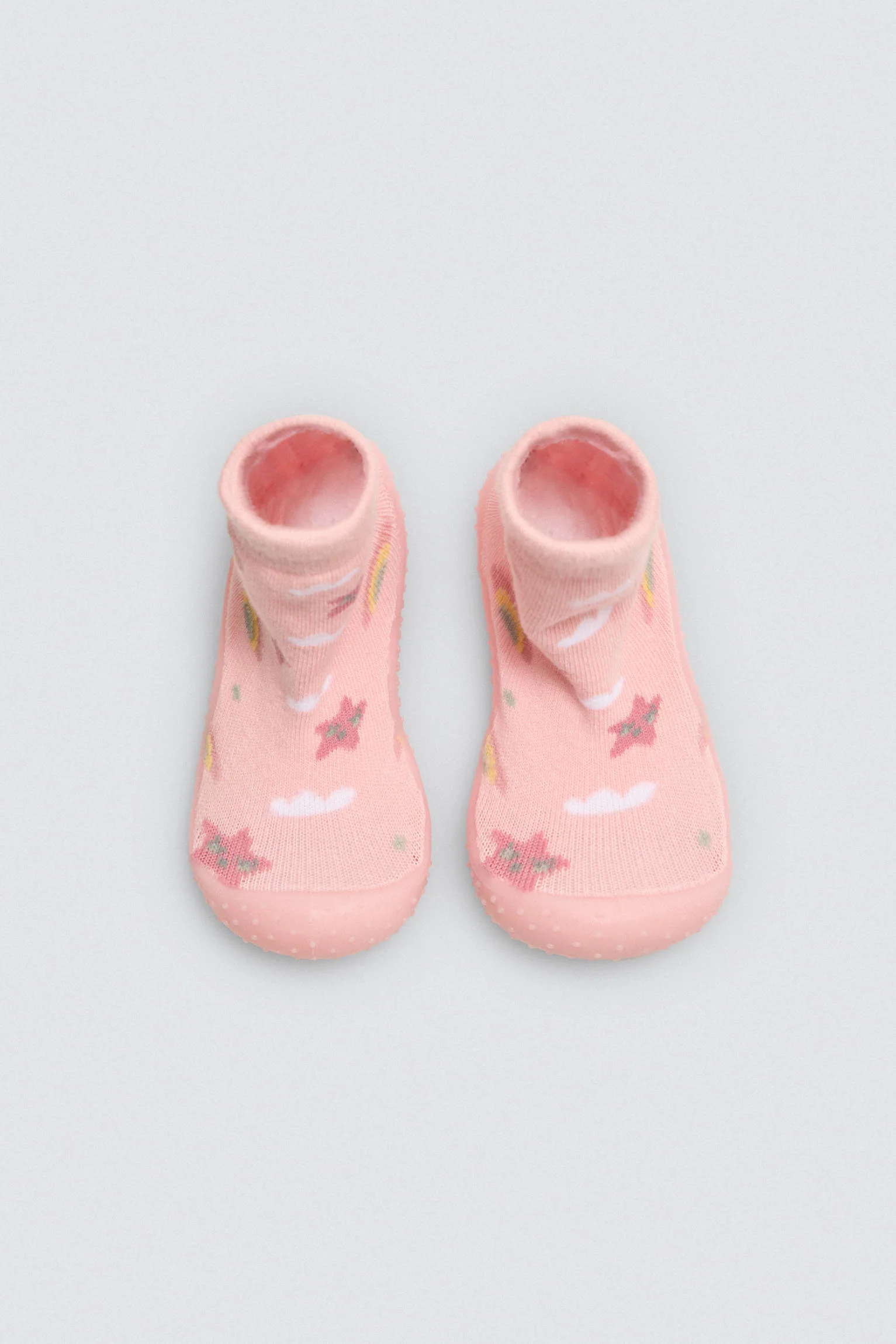 Calzini per neonati con stampa arcobaleno e stelle, pensati per accompagnare delicatamente e in sicurezza i loro primi passi. Sono dotati di suola antiscivolo per una maggiore stabilitร , soletta piacevolmente profumata e soletta interna rimovibile per una facile pulizia. Un design comodo, flessibile e fantasioso per l’uso quotidiano.