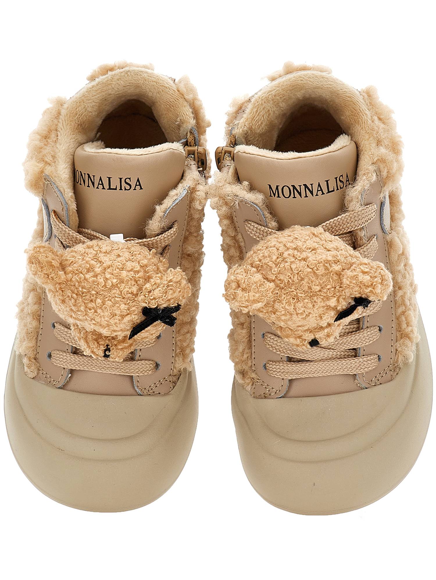 Sneakers per bambina Monnalisa beige in shearling Realizzato in tessuto 100%, poliuretano 100%. Il prodotto presenta una chiusura frontale con lacci, chiusura laterale con zip, dettaglio con orso, soletta con logo.