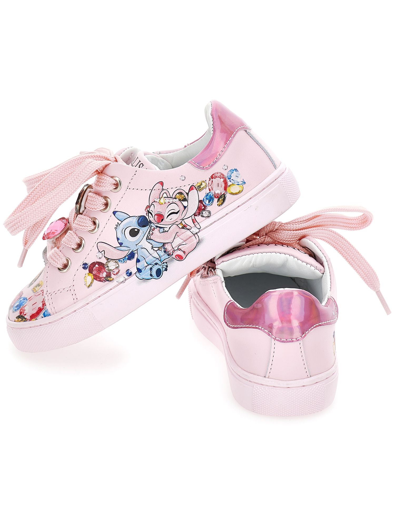 Sneakers per bambina Monnalisa rosa con fantasia Stitch, realizzata in pelle di vitello 100%. Il prodotto presenta un colore rosa, chiusura frontale con lacci, imbottitura nella caviglia, punta tonda, suola piatta in gomma, dettaglio pietre.